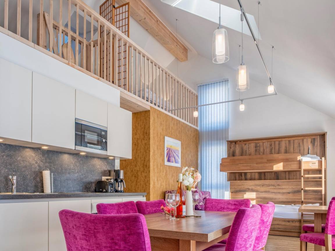 Hausbeschreibung : Diese Wohnung im zweiten Stock ist nicht nur ein Ort zum Schlafen, sondern Ihr neues Zuhause auf Zeit in den Bergen. Mit einem gemütlichen Loft für kühle Abende, einer offenen Küche, die zum Kochabenteuer einlädt und einem Balkon, auf dem Sie die frische Bergluft umarmt. Hier verschmelzen Design und Komfort miteinander. Ob Sie es sich auf dem Schlafsofa gemütlich machen oder am Tisch für acht Personen den Tag besprechen, hier werden Erinnerungen geschaffen!