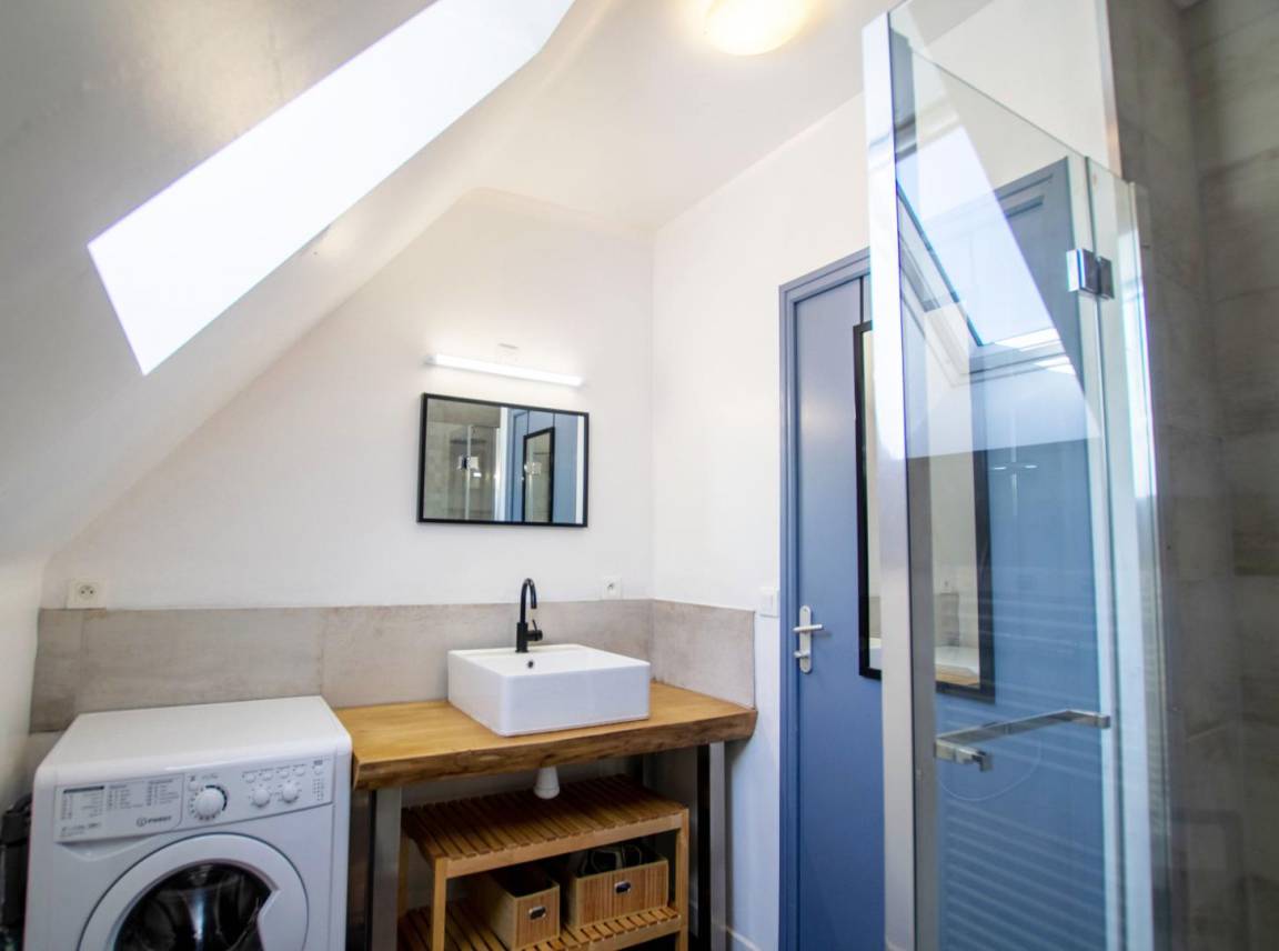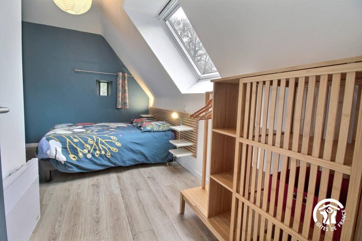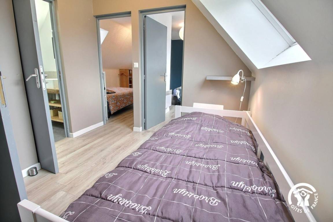 - Im 1. Stock ein Schlafbereich im Zwischengeschoss mit einem 90x190-Bett, der Zugang zu zwei Doppelzimmern mit jeweils einem 140x190-Bett und Zugang zum Badezimmer mit ebenerdiger Dusche und Toilette bietet.