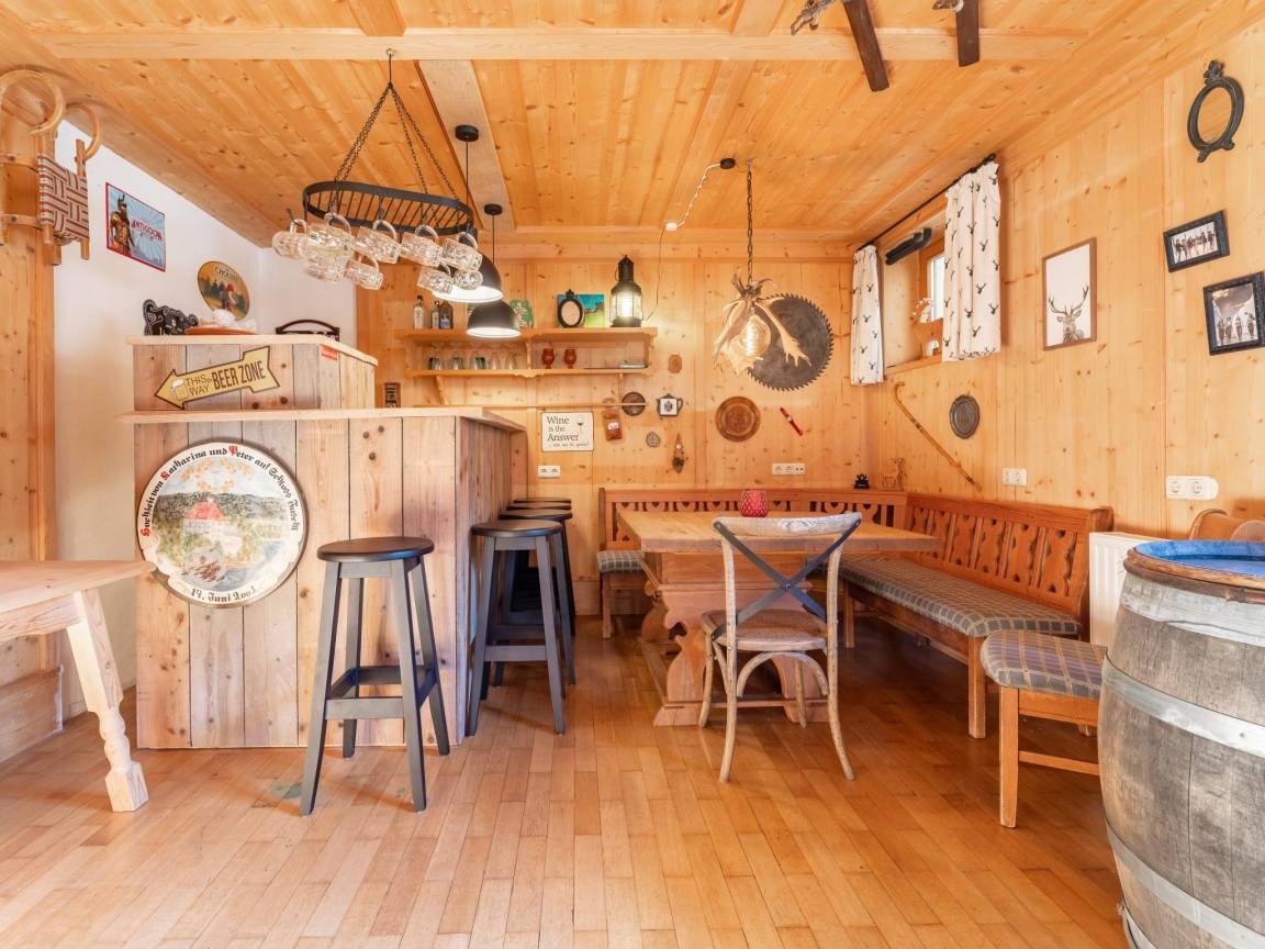 Und als Krönung des Ganzen gibt es im Erdgeschoss eine gemütliche Stube mit Bar für einen Drink nach dem Skifahren oder ein Spiel.