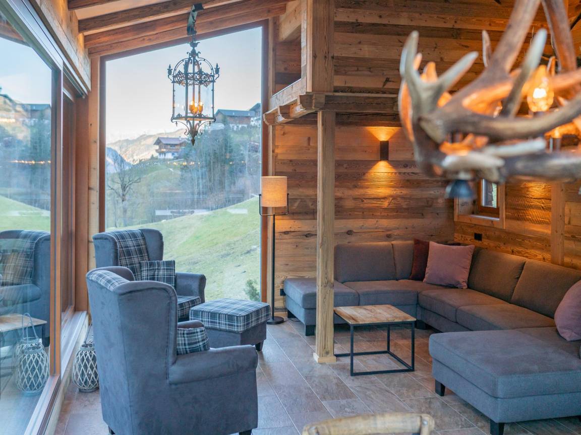 Das Highlight des Hauses ist das große Wohnzimmer mit einer Sitzecke und zwei großen Tischen mit reichlich Sitzgelegenheiten rundherum. Und was für eine wunderbare Aussicht auf die umliegende Berglandschaft durch die großen Fenster auf 3 Seiten. Ein wahres Panorama