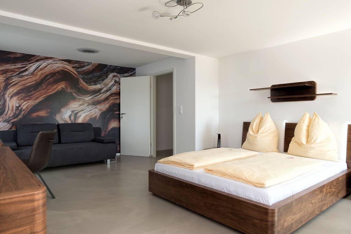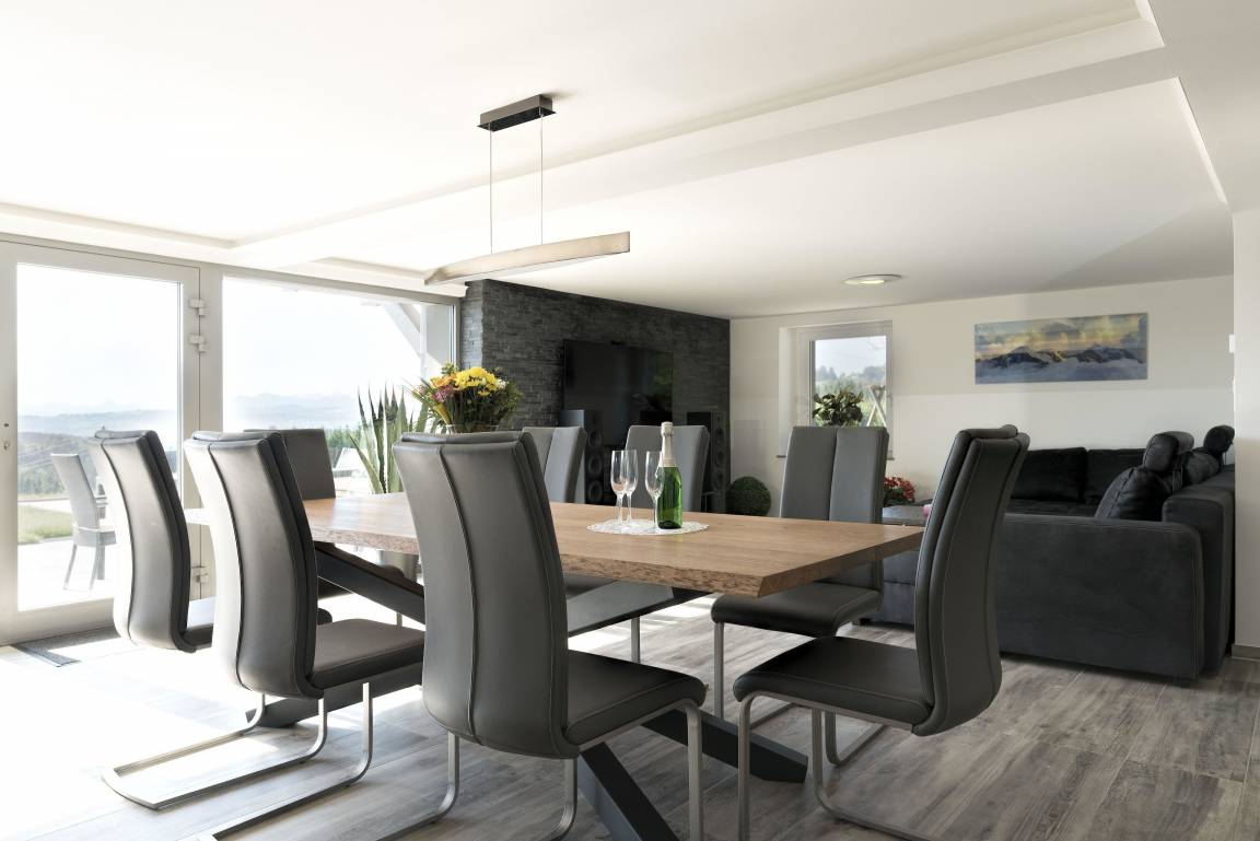 Die Suite Panoramablick erstreckt sich über zwei Stockwerke und bietet mit ihren 3 Schlafzimmern sowie 2 Schlafcouches Platz für 6-10 Gäste. Genießen Sie den traumhaften Ausblick auf die umliegenden Wiesen, Berge und das Umland.