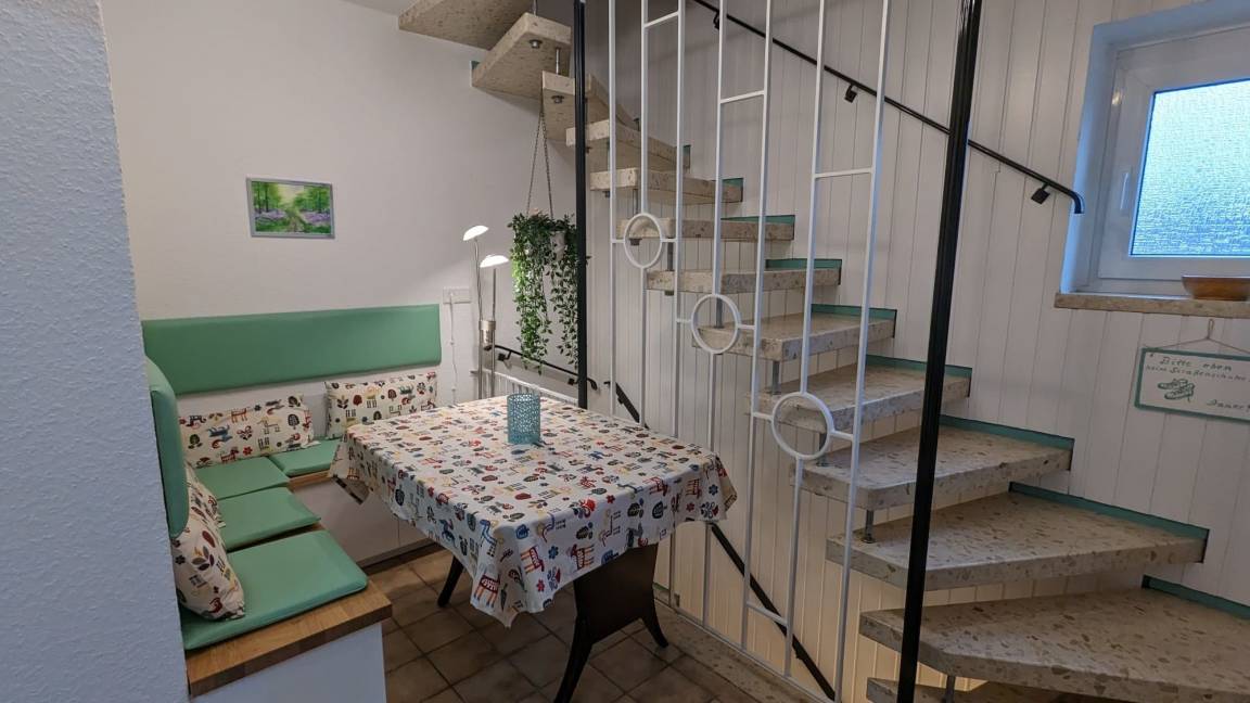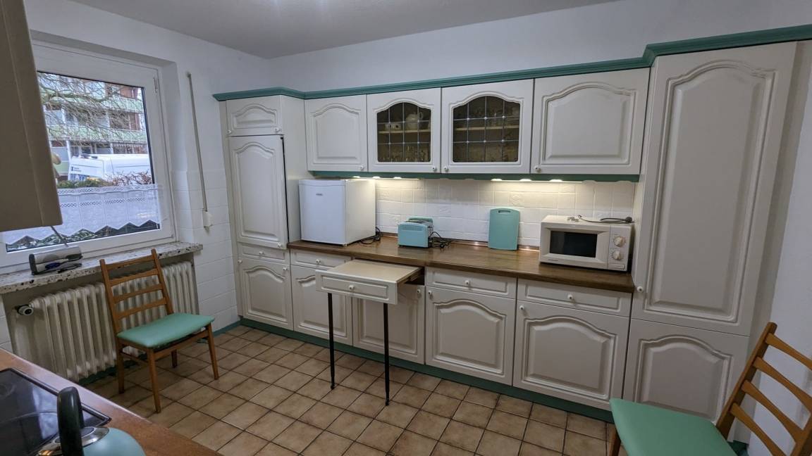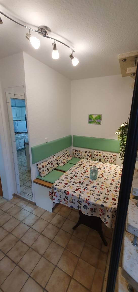 Die farblich aufgefrischte alte Holzküche im Erdgeschoss verfügt über einen kleinen Ausziehtisch sowie Umluft-Backofen, vier Ceran-Kochfelder, Dunstabzug, Mikrowelle, Spülmaschine, Kühlschrank, Mini-Gefrierschrank, Toaster, Kaffeemaschine, Zitruspresse, Mixer und Wasserkocher. Für gemeinsame Mahlzeiten und Spieleabende wurde in der kleinen Diele neben der Küche eine gemütliche Sitzecke mit Stauraum für eine schöne Auswahl an Gesellschaftsspielen eingebaut.
