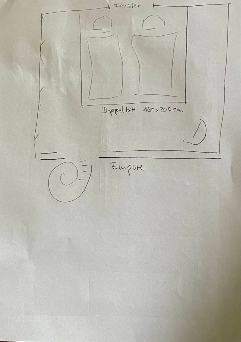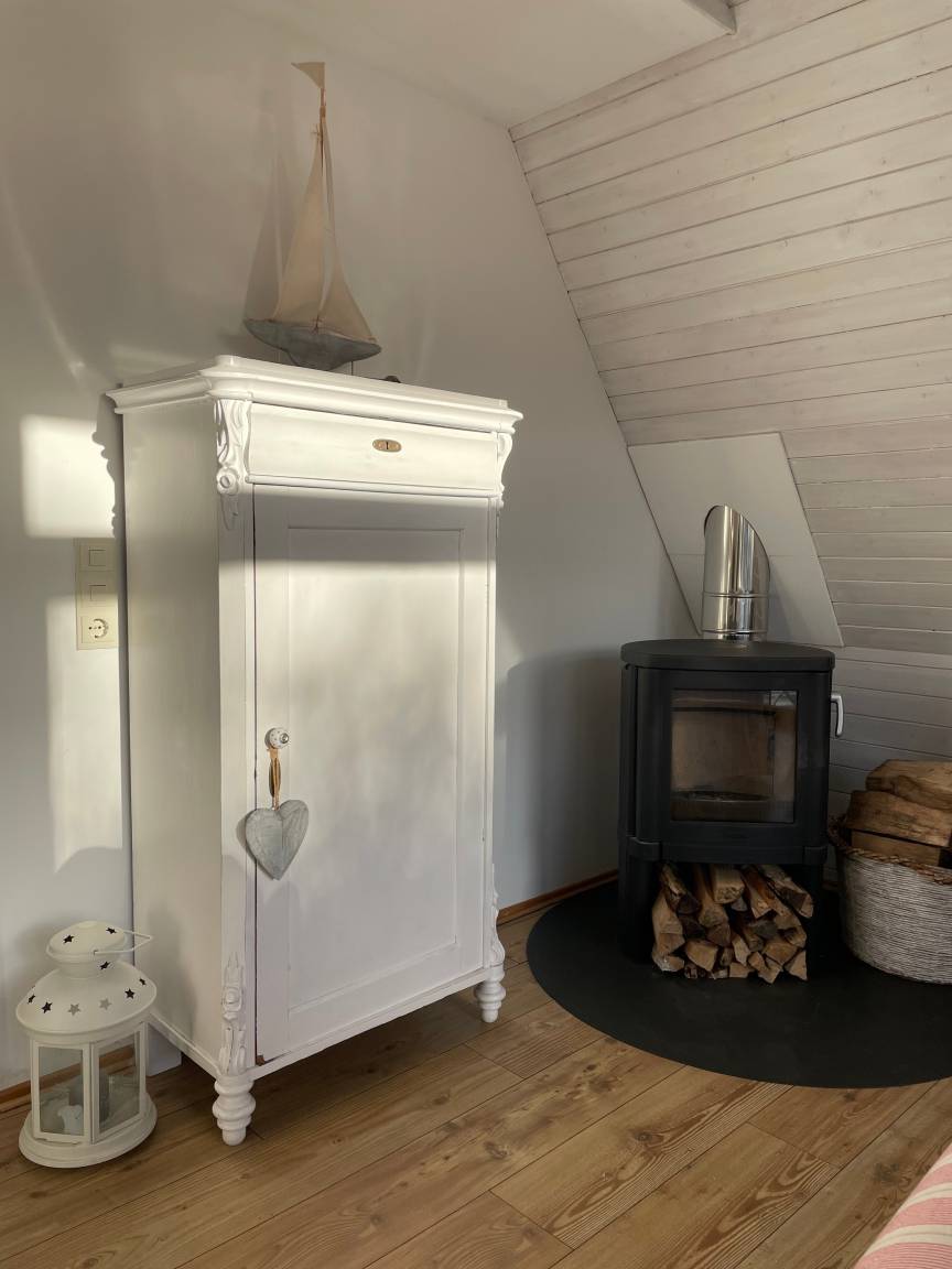 Der große, nach oben hin offene Wohnbereich strahlt eine gemütliche Atmosphäre aus. Über eine Wendeltreppe erreicht man eine Empore. Hier befindet sich der Schlafbereich mit einem Doppelbett.