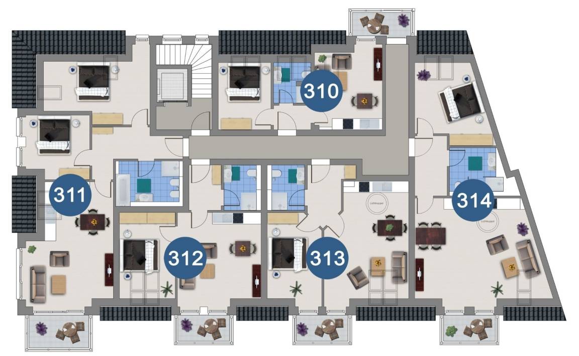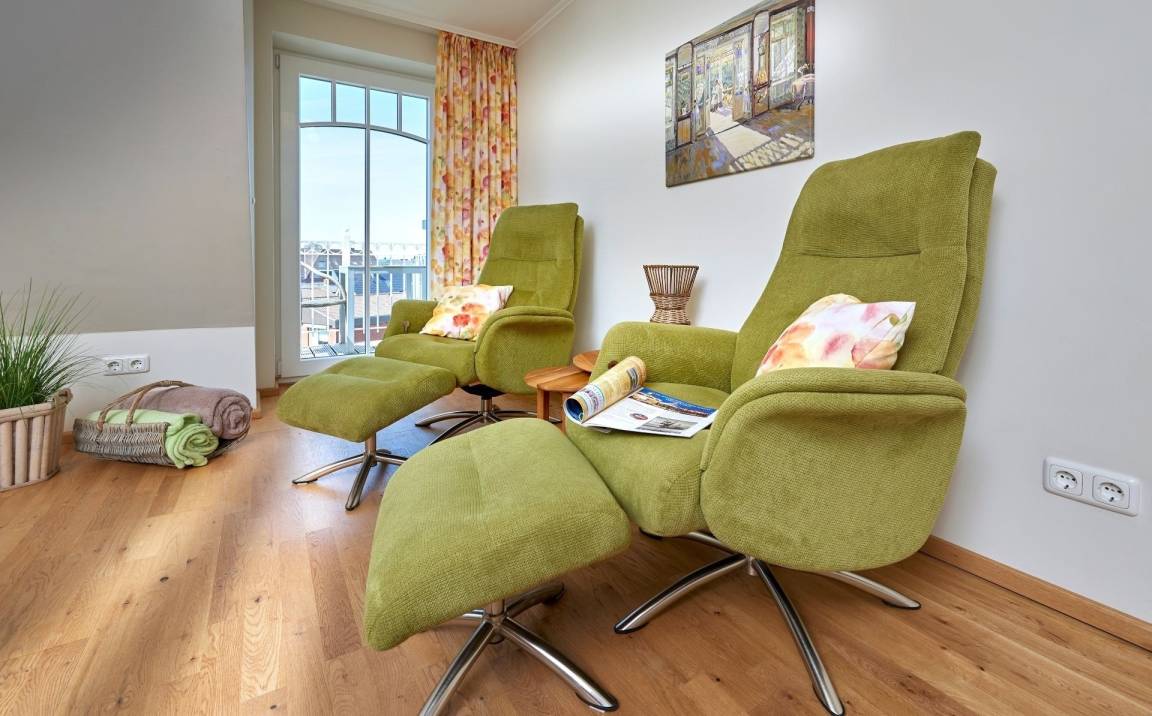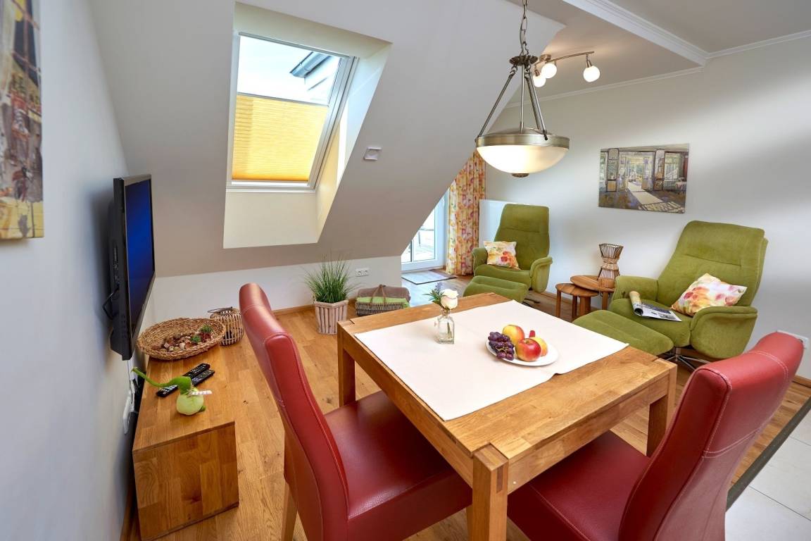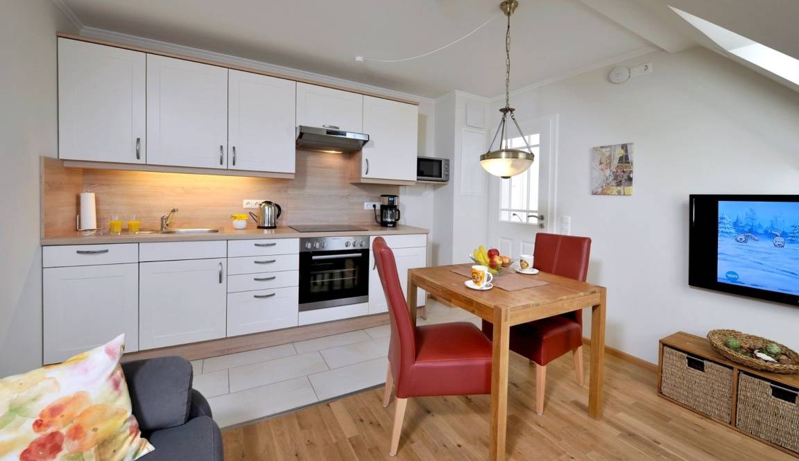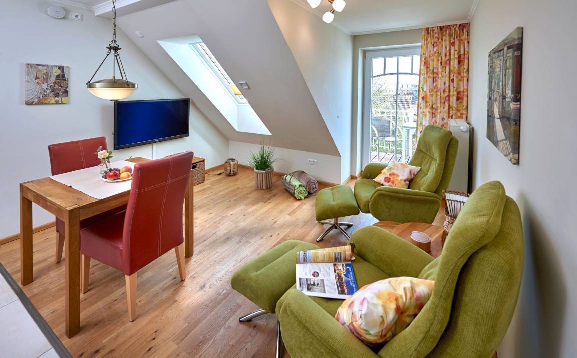 Diese kleine aber dennoch sehr gemütliche Ferienwohnung im Dachgeschoss des Hauses bietet Platz für maximal zwei Personen. Die hochwertige Schallisolierung der Räume sorgt für angenehme Ruhe, die Sie auf bequemen Relax-Sesseln genießen können. Daneben sorgen Holzfußböden im Wohn- und Schlafzimmer für eine freundliche und erholsame Atmosphäre. Durch die vielen großen Dachfenster sind alle Räume lichtdurchflutet. Besonderen Komfort bieten wir mit einer hochwertigen Ausstattung der Ferienwohnung und stufenfreien Zugängen, insbesondere mittels Aufzug. Auf dem möblierten Balkon haben Sie einen schönen Blick über Büsum und können bei schönem Wetter den Sonnenschein ab dem frühen Nachmittag bis in den Abend hinein genießen. Sie werden sich bei uns zu jeder Jahreszeit und bei jedem Wetter wohl fühlen.