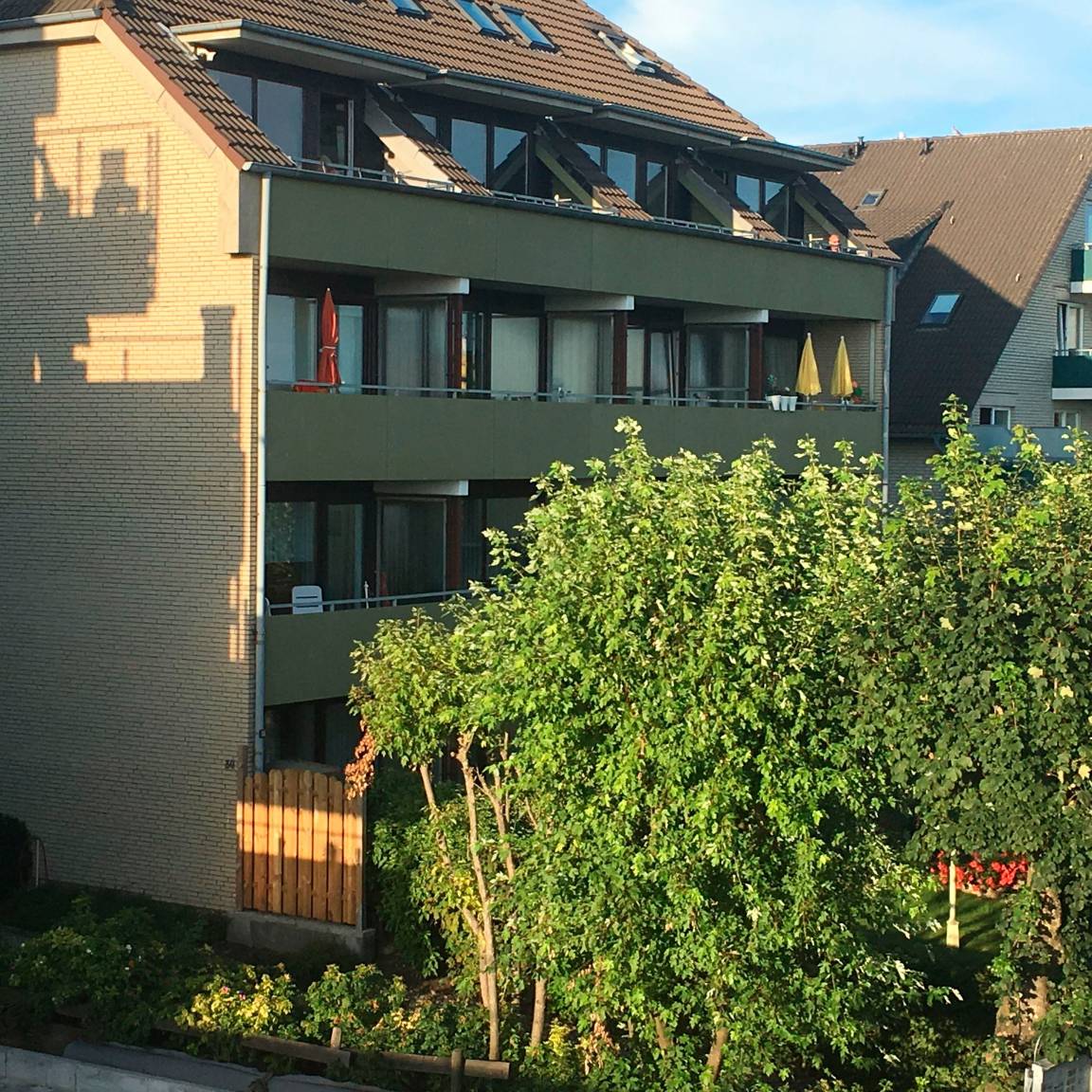 Blick vom Balkon in den Vordergarten und auf den Deich