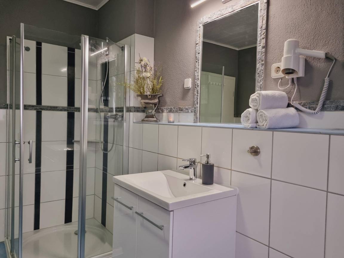 Im Bad finden Sie eine Dusche, WC, Waschbecken und Föhn.