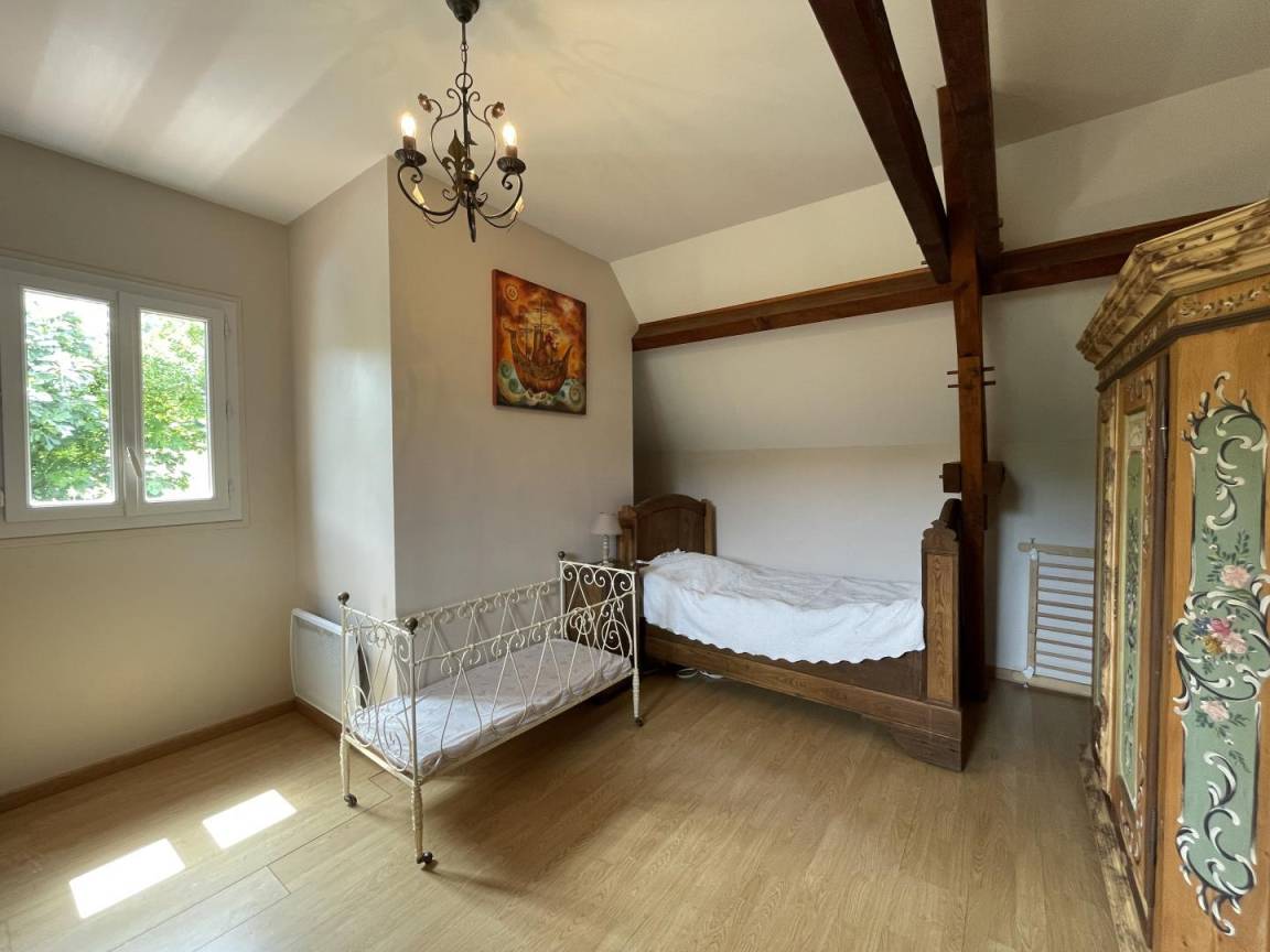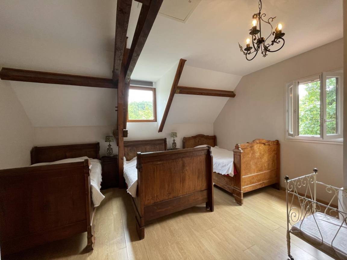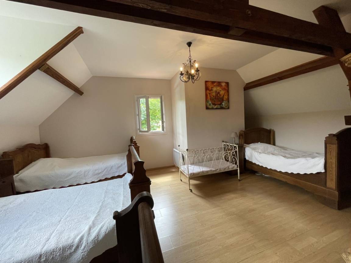 Obergeschoss: 1 Elternschlafzimmer (1 Doppelbett) + 1 Kinderzimmer im Schlafsaalstil mit 4 antiken Betten (3 Einzelbetten, 1 Doppelbett, 1 Babybett).