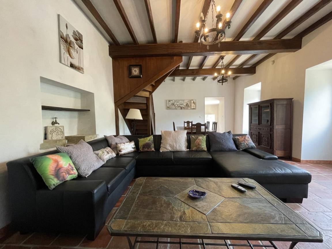Erdgeschoss: Geräumiges Wohnzimmer mit Sitzecke (Kamin/Holzofen, TV, Ecksofa, Glasfaser-WLAN).