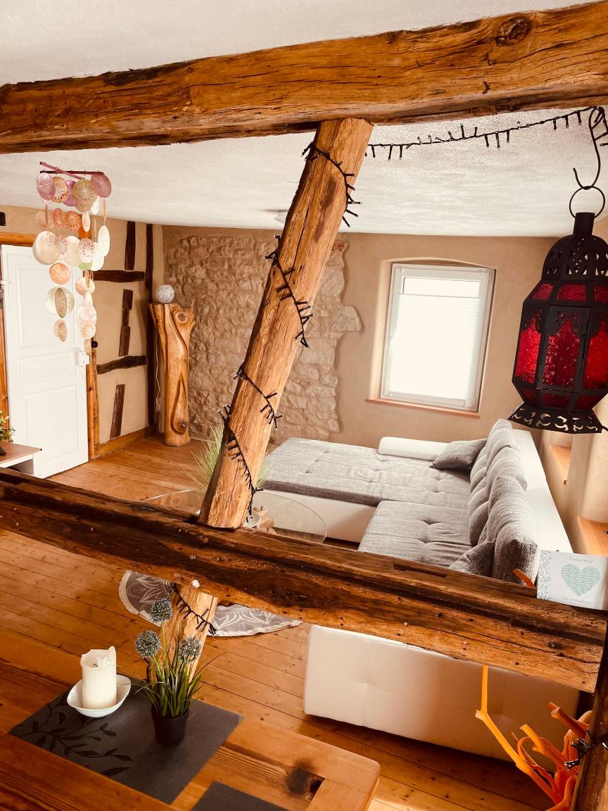 Der große Wohn/Essraum ist mit offenem Fachwerk getrennt.