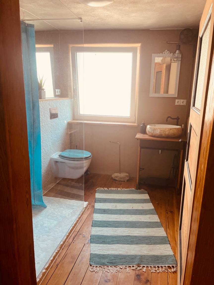 Das Badezimmer ist mit einer großen Familiendusche und warmen Wänden ausgestattet.