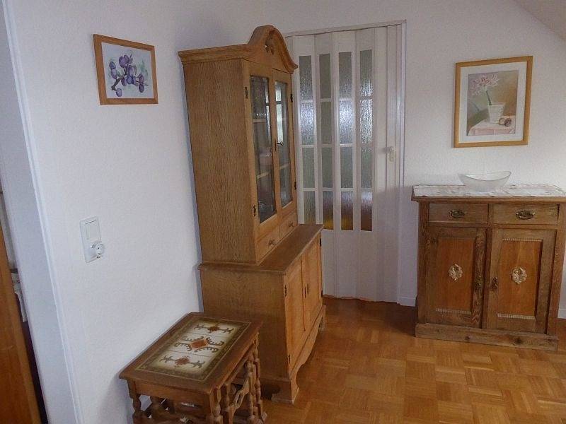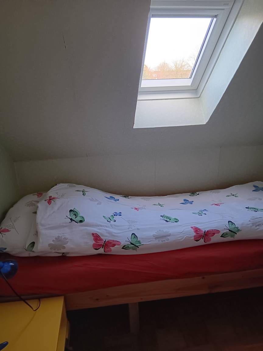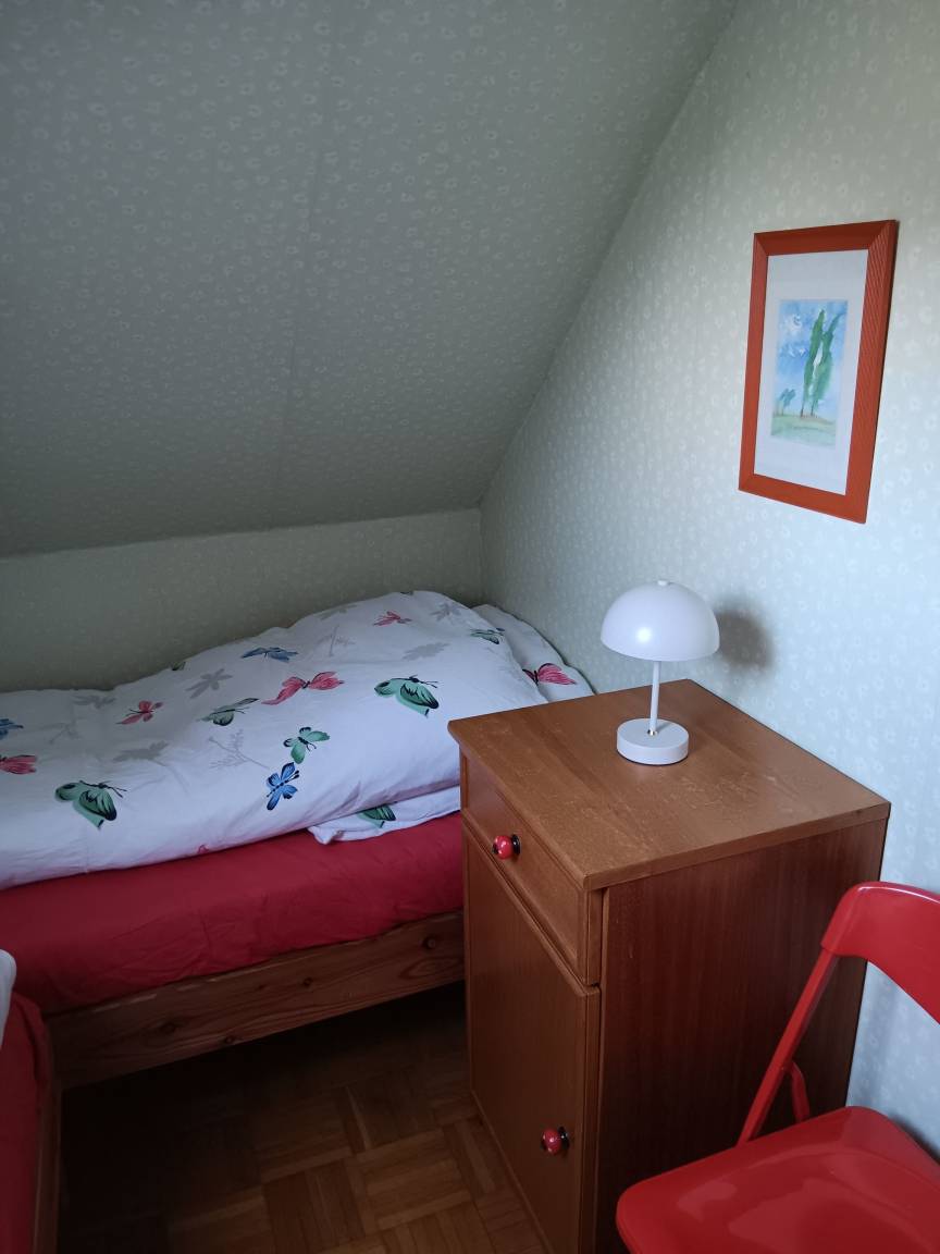 Die Ferienwohnung ist eine Einliegerwohnung im Dachgeschoss eines Einfamilienhauses. Das Haus befindet sich auf einem 930 m² großen Grundstück. Zu Fuß erreichen Sie in 20 Minuten das Weltkulturerbe Haithabu und in nur 3 Minuten den Verbindungswall. Die Schlei ist etwa 5 km vom Grundstück entfernt.