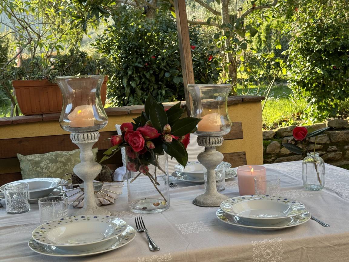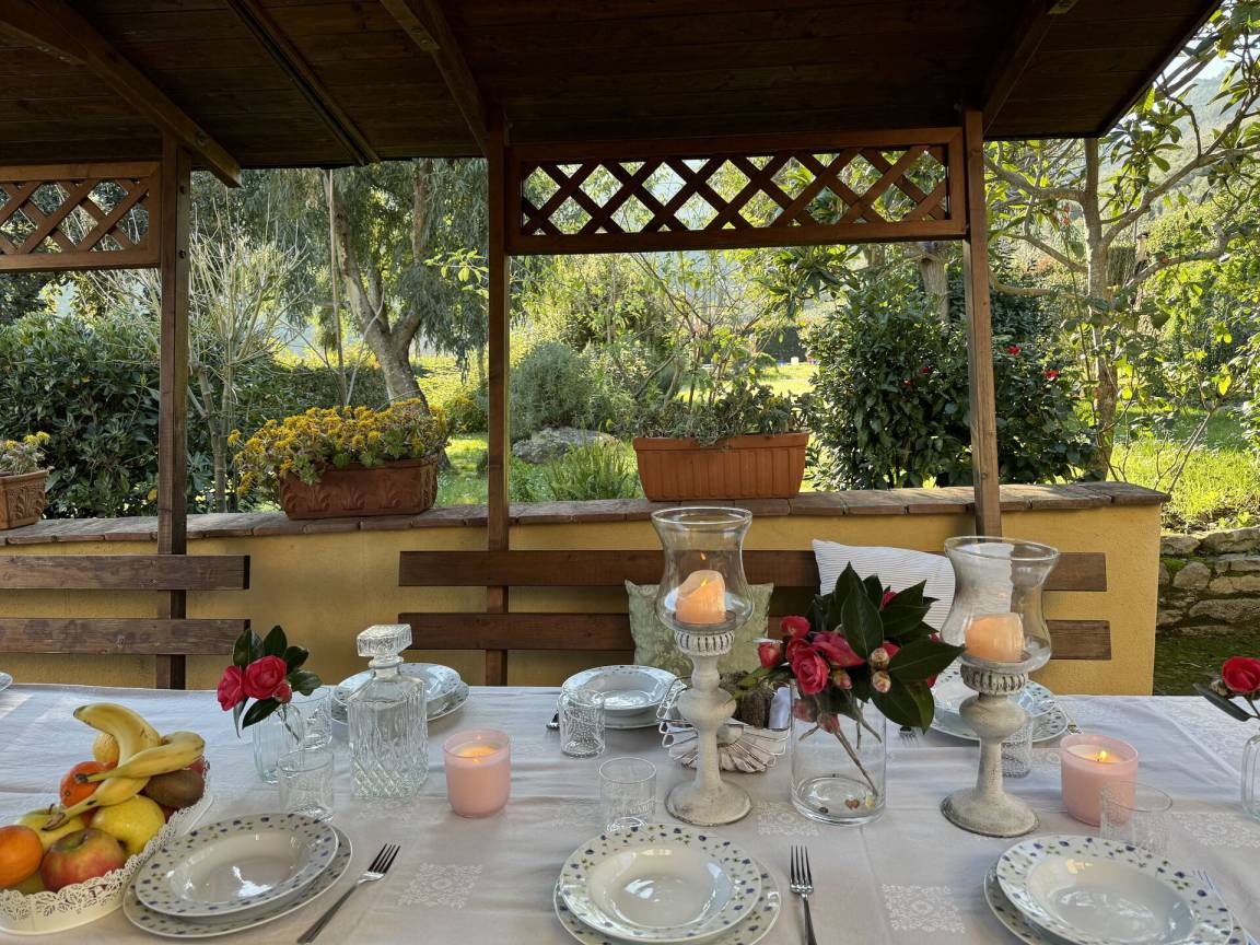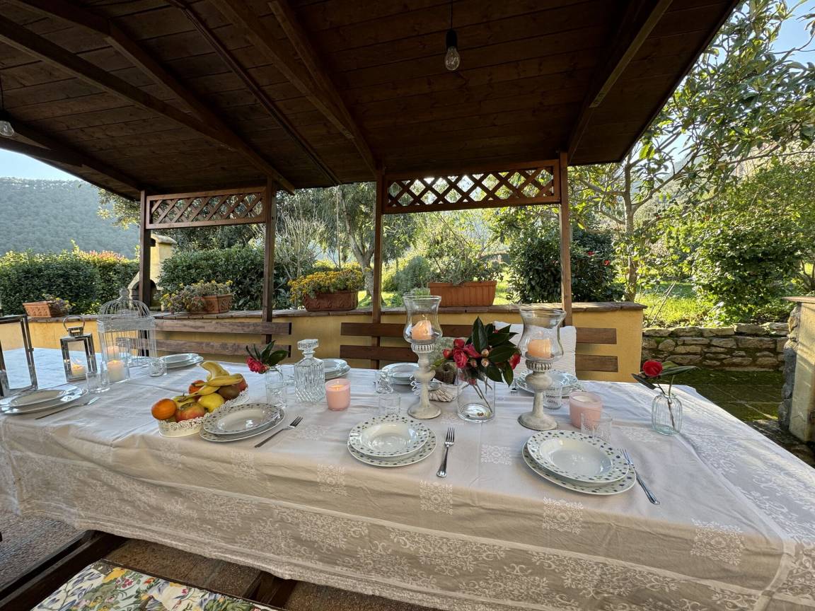 Veranda: Außenbereich für das Essen im Freien, Esstisch, Grill.