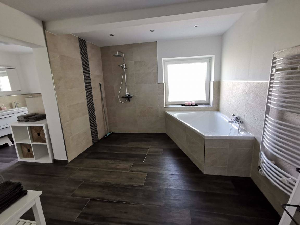 Die begehbare barrierefreie Dusche und die Eckbadewanne sind im zweiten Raum.