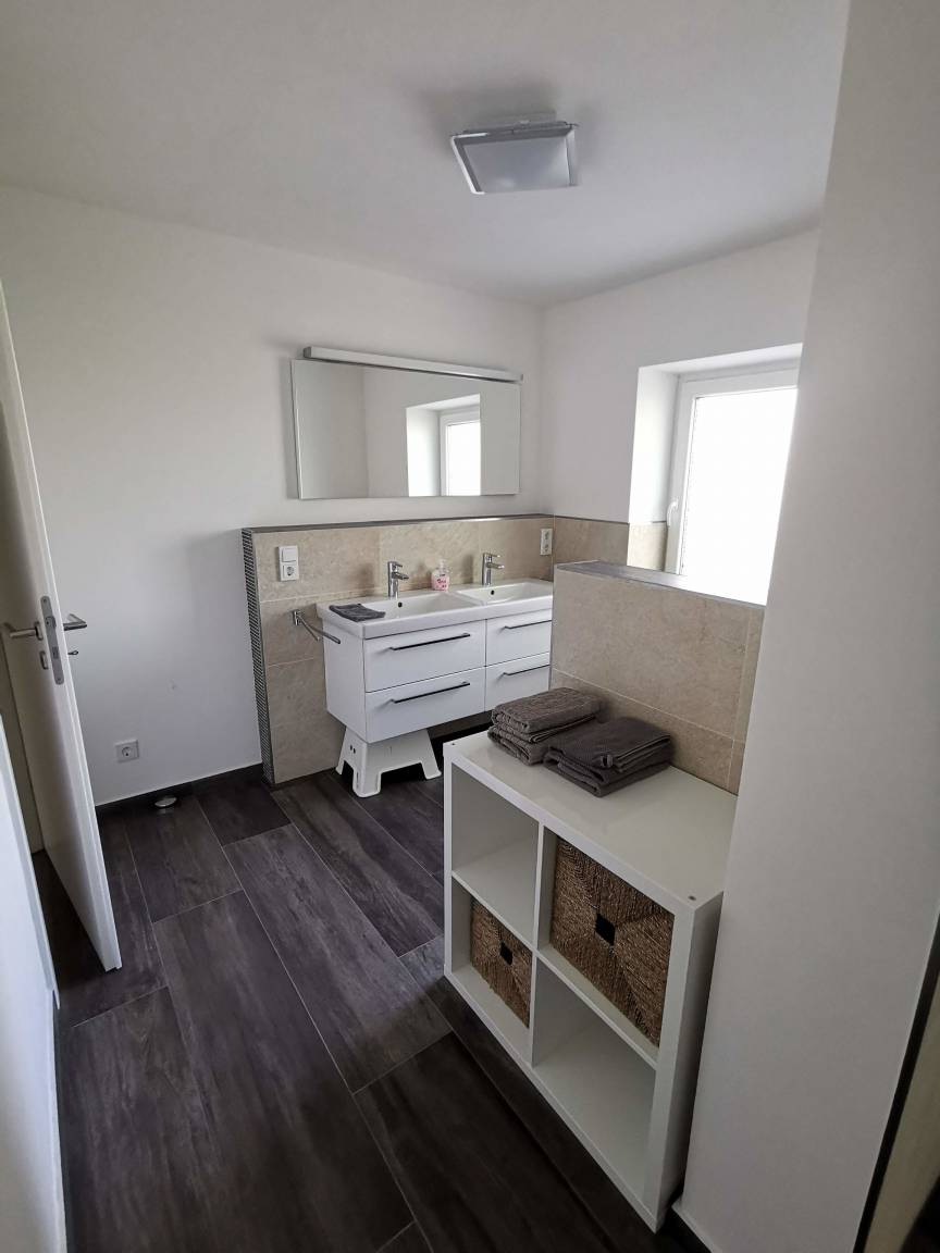 Im ersten Raum befindet sich ein Doppelwaschtisch mit großem Spiegel und WC.