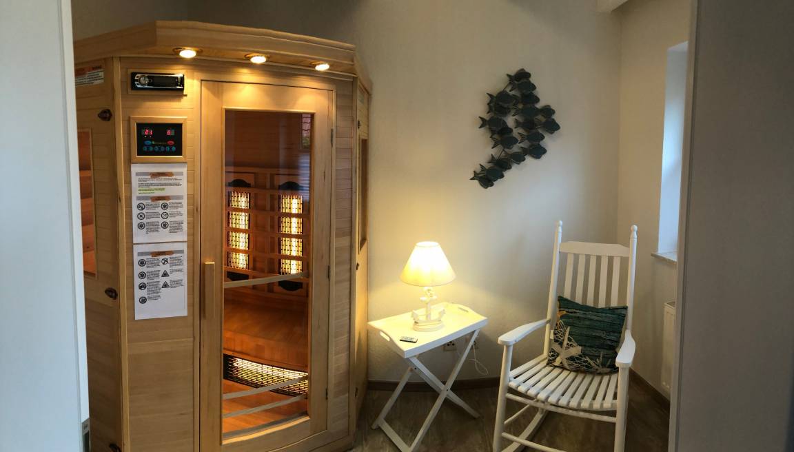 Ein besonderes Highlight ist das Wellness Zimmer im Erdgeschoss. Hier steht eine Infrarotwärmekabine für 2 Personen zur Verfügung in der man sich an kalten Tagen oder nach einem windigen Spaziergang am Strand entspannen und aufwärmen kann. Auch dieses Fenster verfügt über ein Insektenschutzgitter. Bitte beachten Sie unbedingt die Hinweise zur Benutzung und Sicherheit in unserem Hausordner.