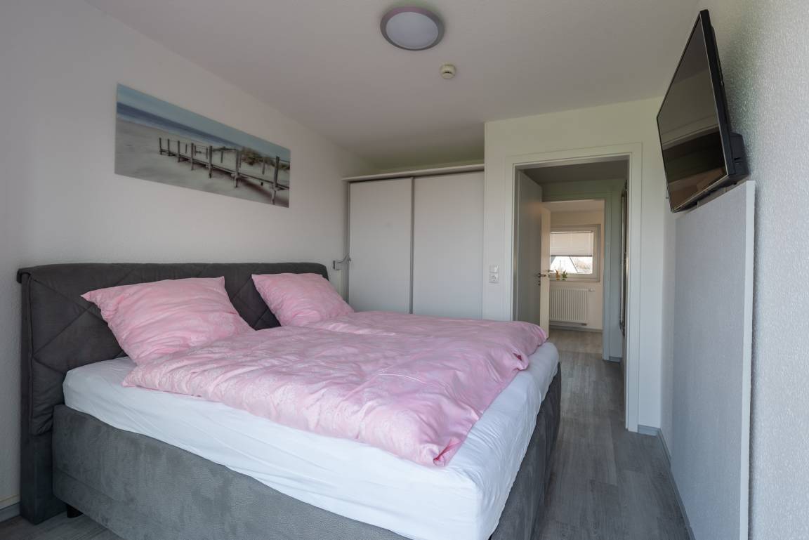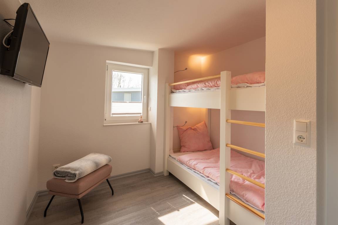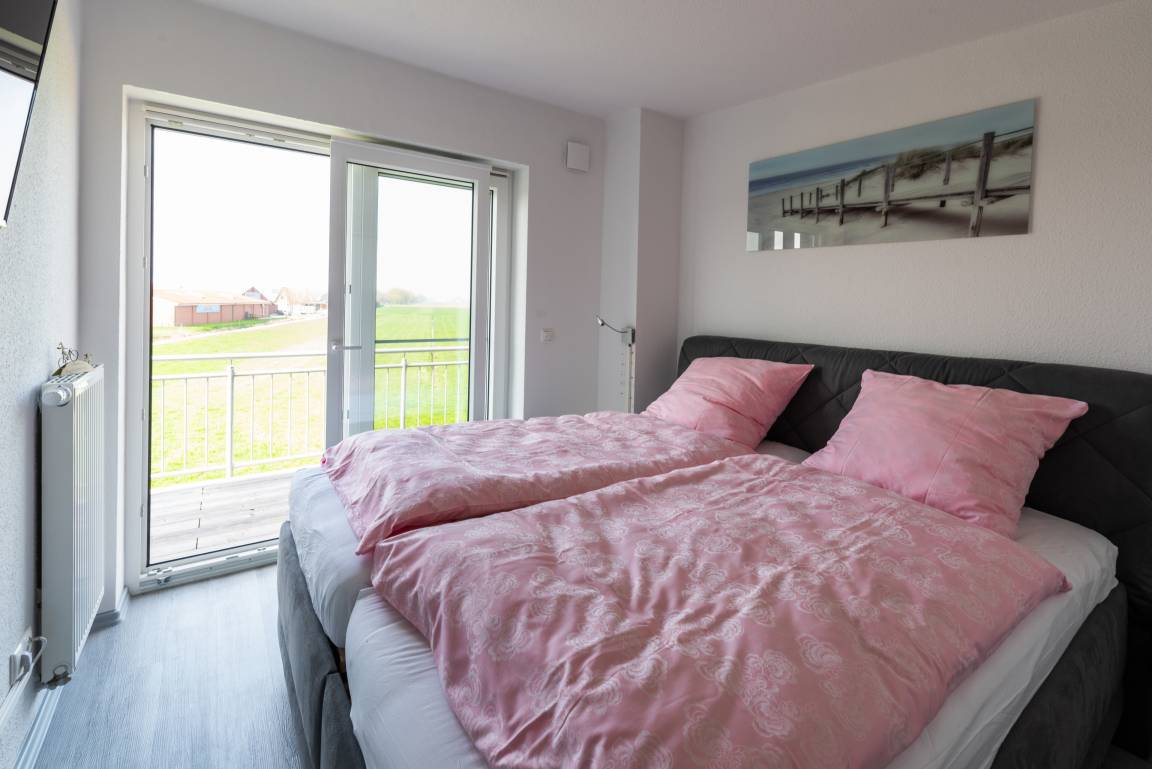 Im Kinderzimmer ist ein Etagenbett vorzufinden, sowie ebenfalls ein Flachbildfernseher An dem Schlafraum mit dem Doppelbett ist ein großer Balkon mit freiem Blick auf das Feld und auf den Deich.