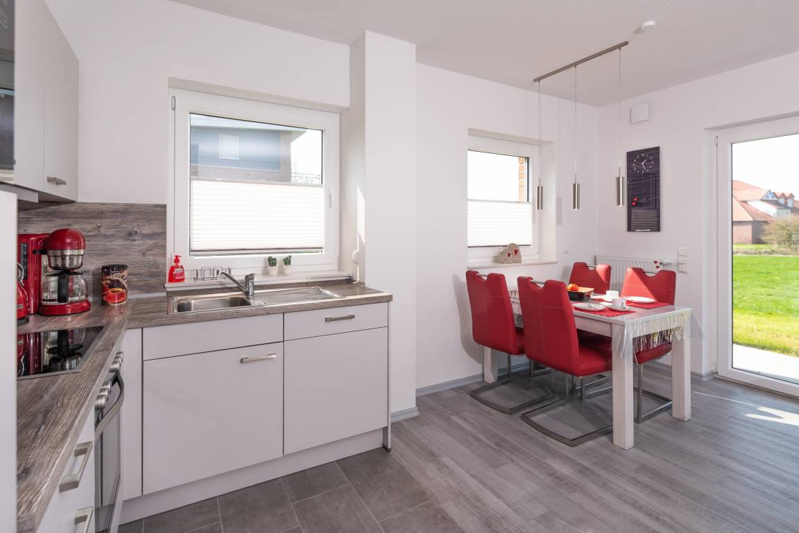 Dieses gemütlich eingerichtete Ferienhaus hat im Erdgeschoß ein offenes Wohnzimmer mit Küche und Essecke. Ein kleines Bad mit WC und Waschbecken ist vom Flur aus erreichbar, dort ist auch eine Waschmaschine fest installiert. Im offenen Wohnzimmer können Sie an schönen Abendstunden vom Sofa aus dem Anblick des Kamins genießen. An der Wand befindet sich ein großer Flachbildfernseher. Die offene Küche mit Essecke ist sehr gut ausgestattet. Mit z.B. Geschirrspüler, Kühlschrank, Backofen, Mikrowelle, Kaffeemaschine und Wasserkocher und auch sehr geschmackvoll eingerichtet. Vor der großen Fensterfront zum Deich befindet sich eine Terrasse für Sie allein mit Gartenmöbeln. Im oberen Stockwerk befinden sich die Schlafräume, das große Bad mit Dusche / WC und einer sehr schönen Sauna. Im großen Schlafzimmer befindet sich ein Doppelbett, sowie ein Flachbildfernseher.