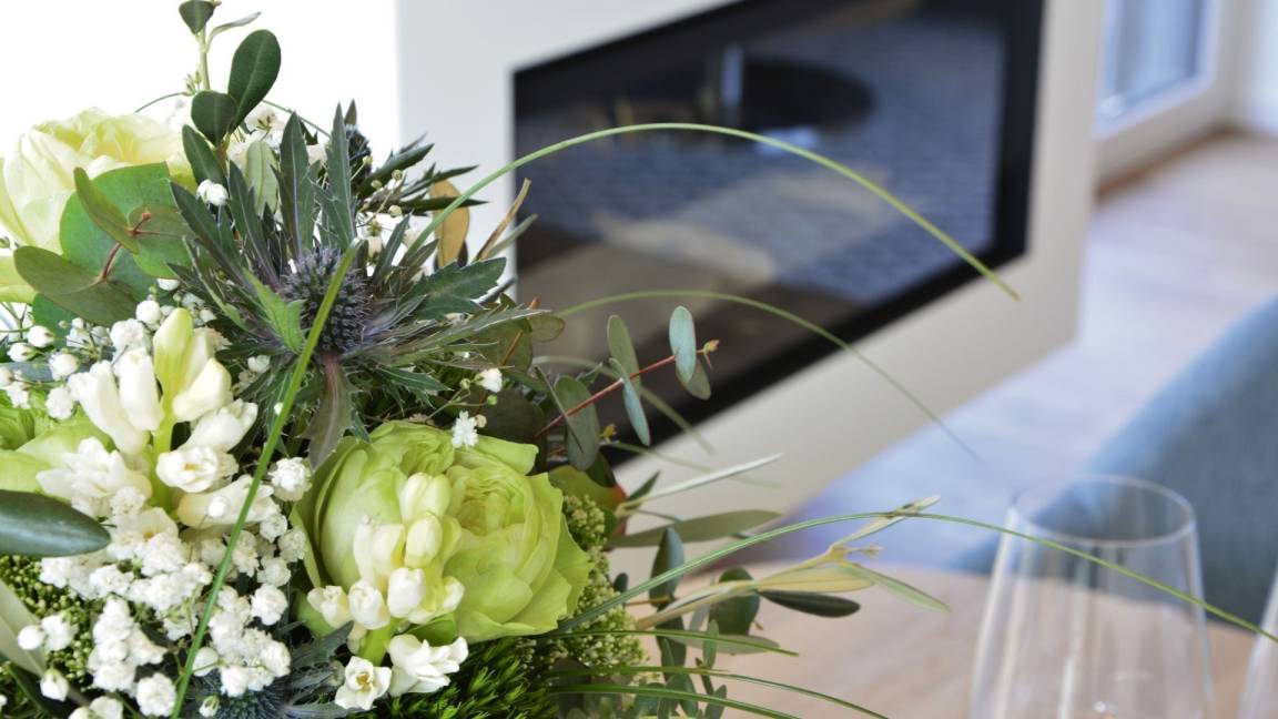 Gemütlicher Wohnbereich mit Elektrokamin und Smart-TV.