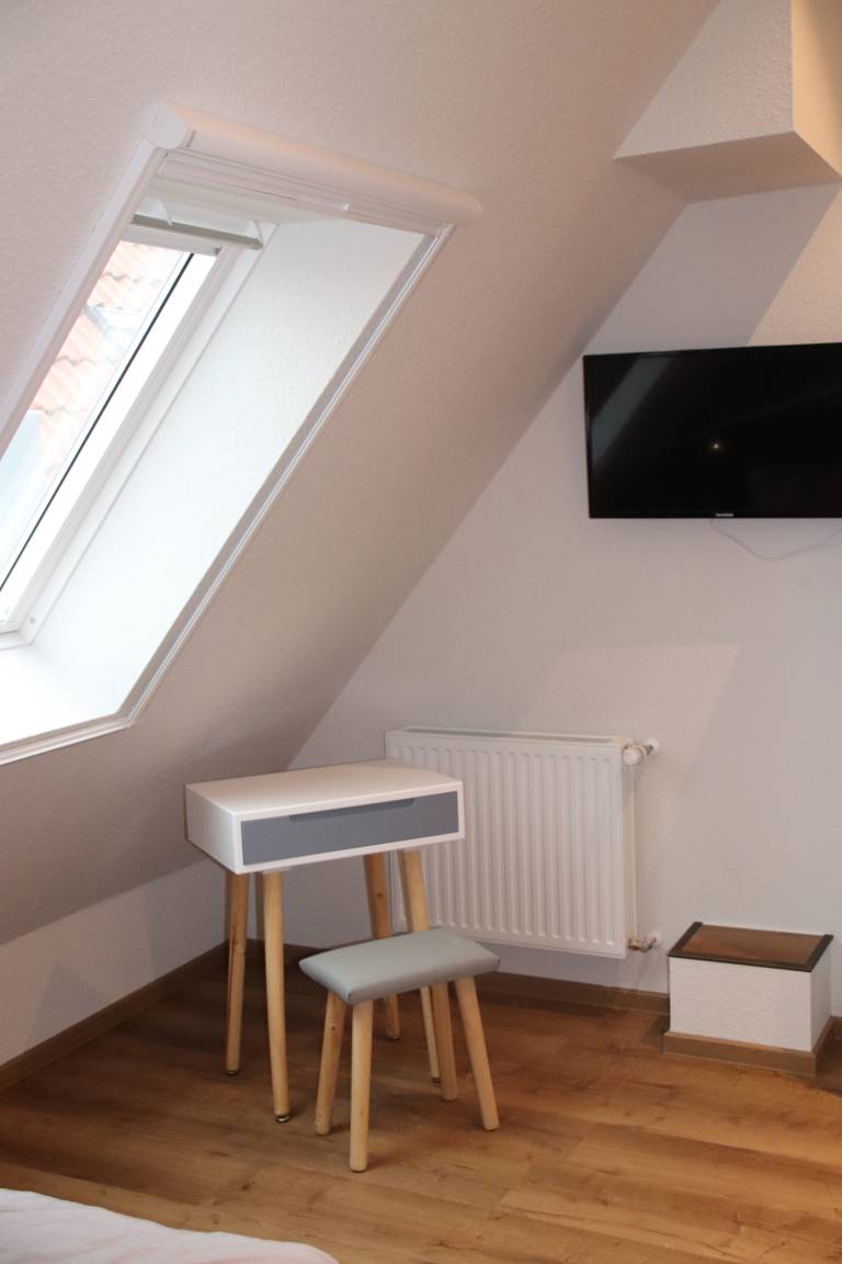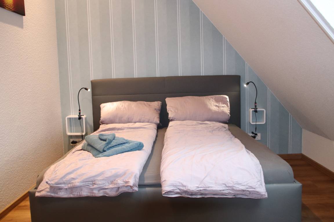 Dachgeschoss: Sehr großes, modernes Schlafzimmer mit Doppelbett, Fernseher, Schrank, und einer gemütlichen Leseecke.