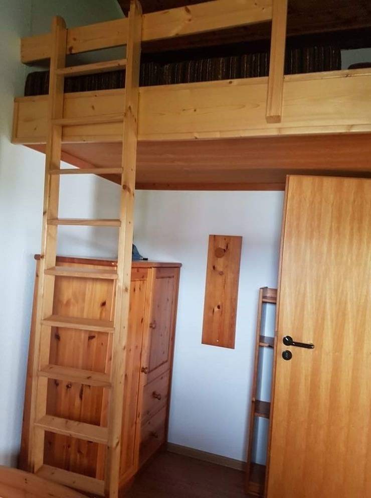 Wir haben gemütlich eingerichteten Wohnraum mit Fernseher, eine vollausgestattete Küche (Geschirrspüler, -Plattenherd, Kühlschrank, Gefrierfach, Backofen, Grill, Mikrowelle, Kaffeemaschine, Toaster u.v.m.) mit Essecke, eine Dusche mit WC sowie einen Abstellraum. An Schlafgelegenheiten stehen zwei Räume zur Verfügung, eines mit Doppelbett und das andere Schlafzimmer mit 2 Einzelbetten, Schrank, Schreibtisch und einer Schlafkoje für eine dritte Person (Kind) über eine Leiter zu erreichen. Eine möblierte Terrasse und ein Rasengrundstück laden für die Sonnenstunden ein. Ein PKW-Stellplatz befindet sich am Haus. Es gibt kostenfreien W-Lan Anschluss.
