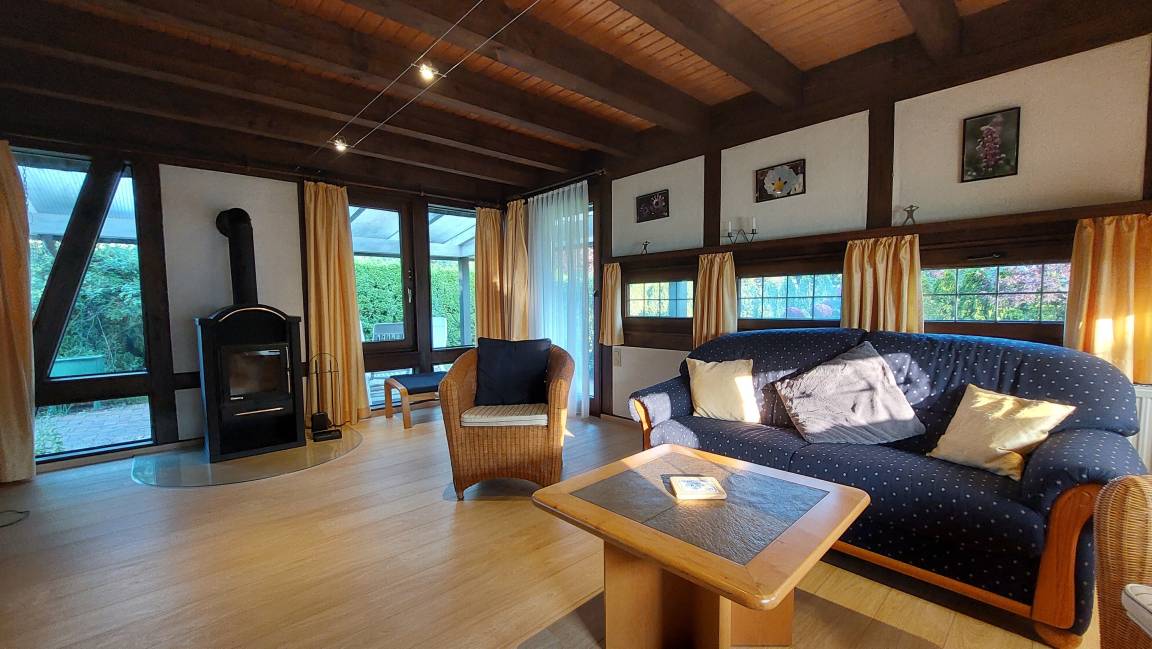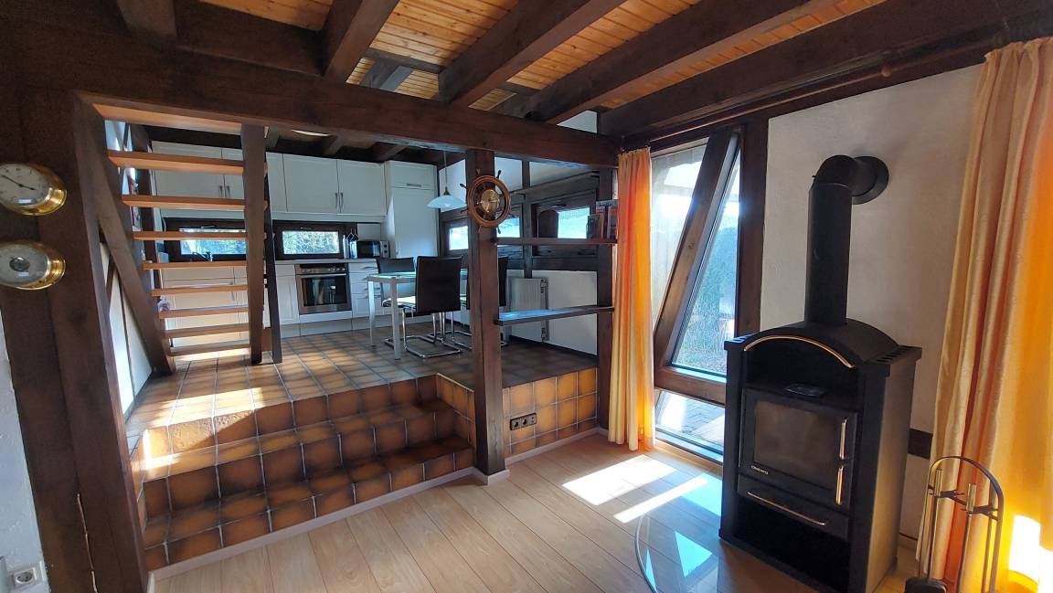 Ein paar Stufen hinab befindet sich das gemütliche Wohnzimmer mit Kamin, Flachbild-TV, DVD Player, Sofa und Sessel. Somit steht einem schönen Film- oder Spieleabend nichts im Weg.
