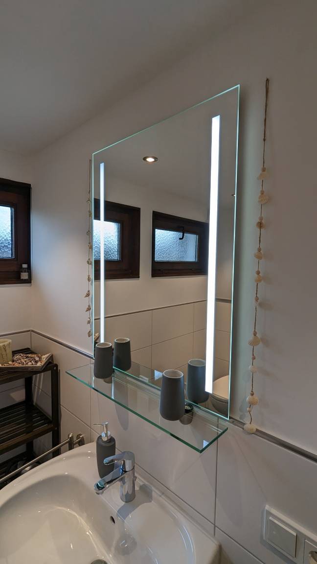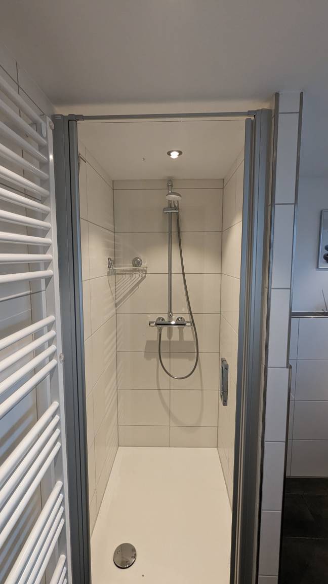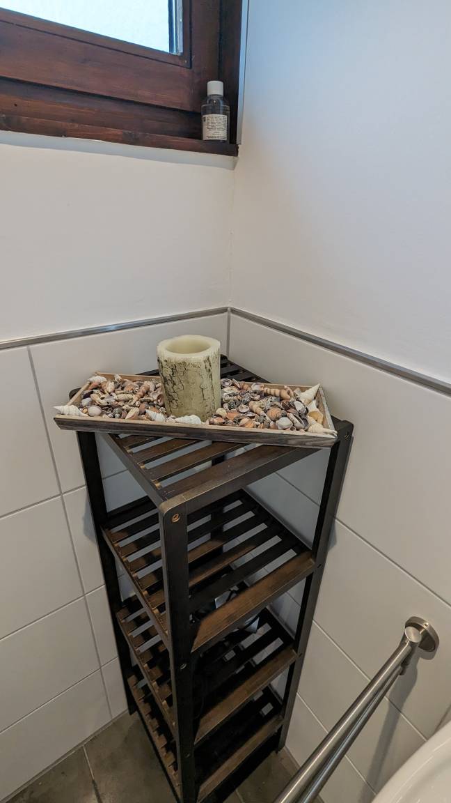 Ebenso befinden sich im Erdgeschoss das Badezimmer mit Dusche und Fön sowie eine Waschmaschine.
