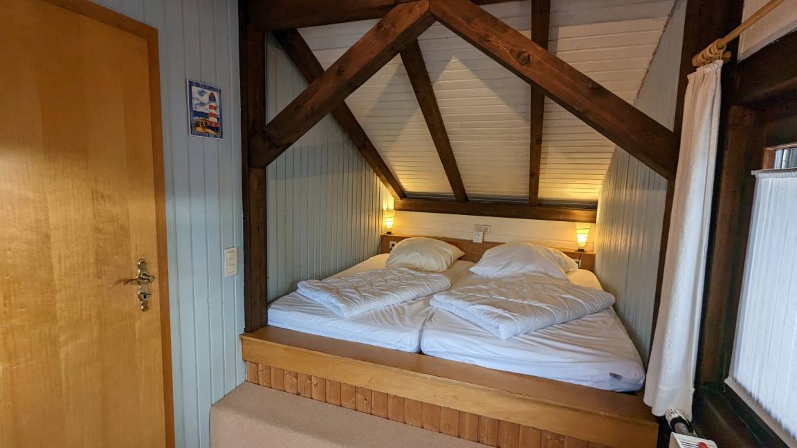 Im Obergeschoss des Ferienhauses befinden sich die 2 Schlafzimmer mit jeweils einem 2,00 x 2,00m Bett.