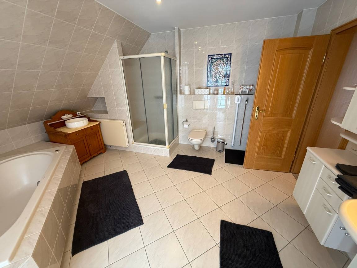 - Schickes Badezimmer mit großer Dusche und Waschtrockner
