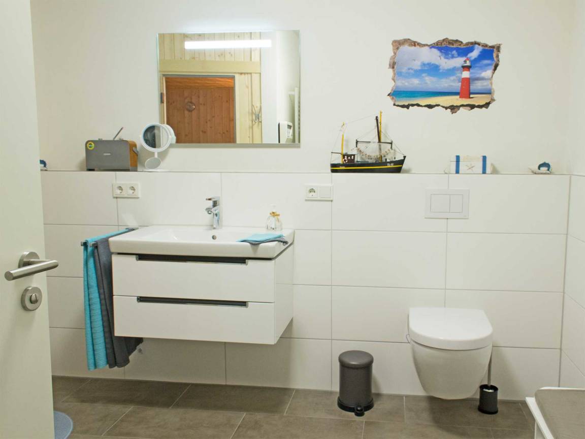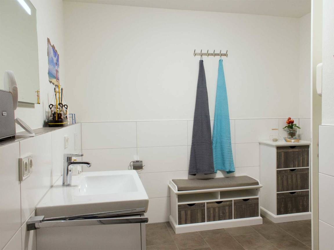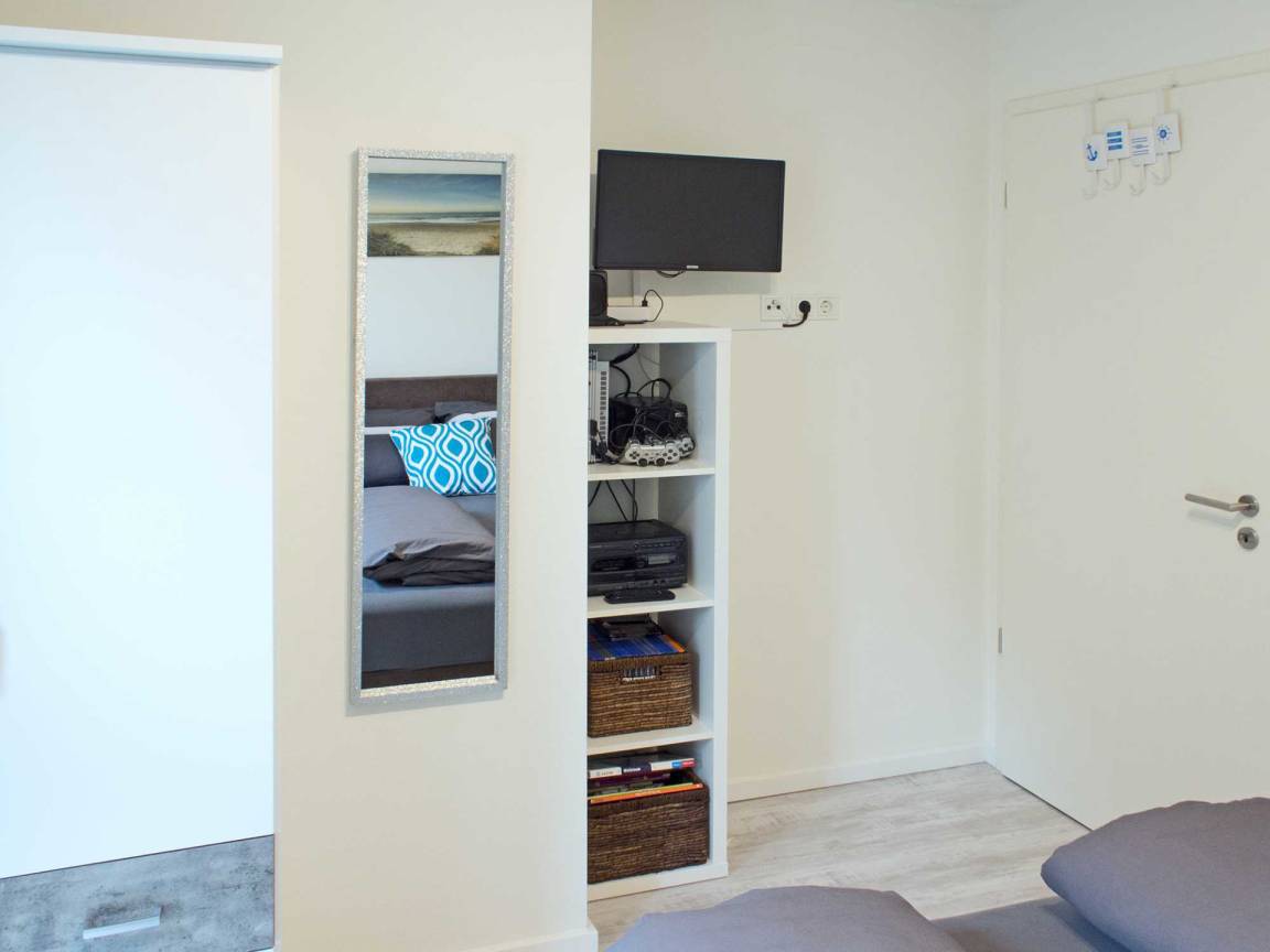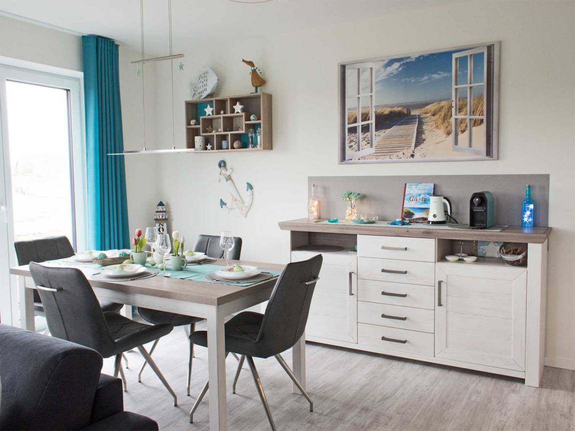Das Zentrum Ihrer Auszeit bildet ein heller, maritimer Wohnraum, in dem Sie die Möglichkeit haben, gemütliche Abende vor dem Kamin zu genießen, Bücher zu lesen, PlayStation zu spielen oder die umfangreiche Sammlung an CDs und DVDs zu nutzen. Das Sofa lässt sich zu einer komfortablen Schlafgelegenheit (160 x 200 mit Lattenrost) umwandeln. Die Wohnung ist für sechs Personen voll ausgestattet. Um gestärkt den neuen Urlaubstag zu beginnen, finden Sie im angrenzenden Essbereich eine Küchenzeile mit hochwertigen Küchengeräten sowie einen Esstisch für sechs Personen. Die Wohnung verfügt über kostenfreies WLAN.