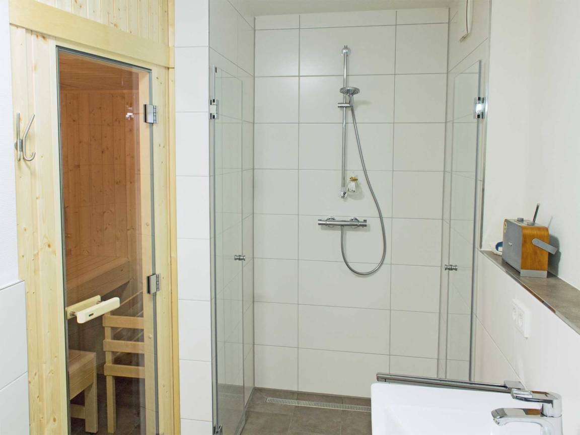 Nach einem ereignisreichen Tag können Sie sich im Badezimmer entspannen. Erholung finden Sie in der wohltuenden Sauna als auch in der ebenerdigen Dusche. Das Waschbecken verfügt über einen großen LED-Spiegel, Schminkspiegel und Haartrockner.