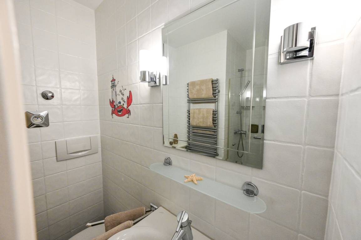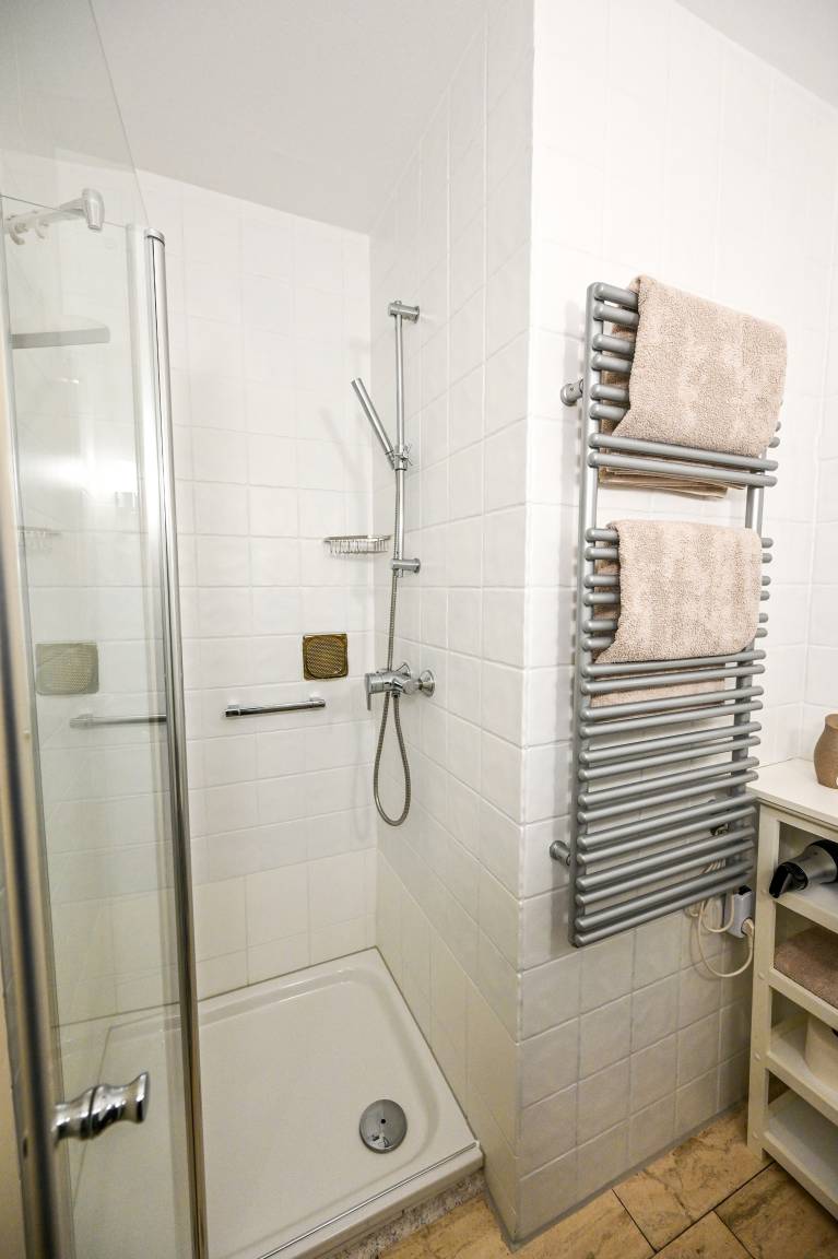 Das Badezimmer beinhaltet eine Dusche und ein WC. Auch ein Spiegel mit viel Licht macht das "Schick-machen" einfacher.