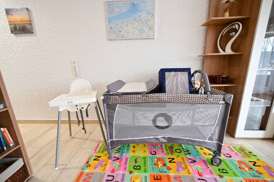 Das Wohnzimmer bietet ein Schlafsofa für zwei Personen. Sie haben ein Baby oder Kleinkind? Kein Problem – ein Babybett, ein Kinderhochstuhl sowie eine Spielmatte bieten Ihnen Komfort.