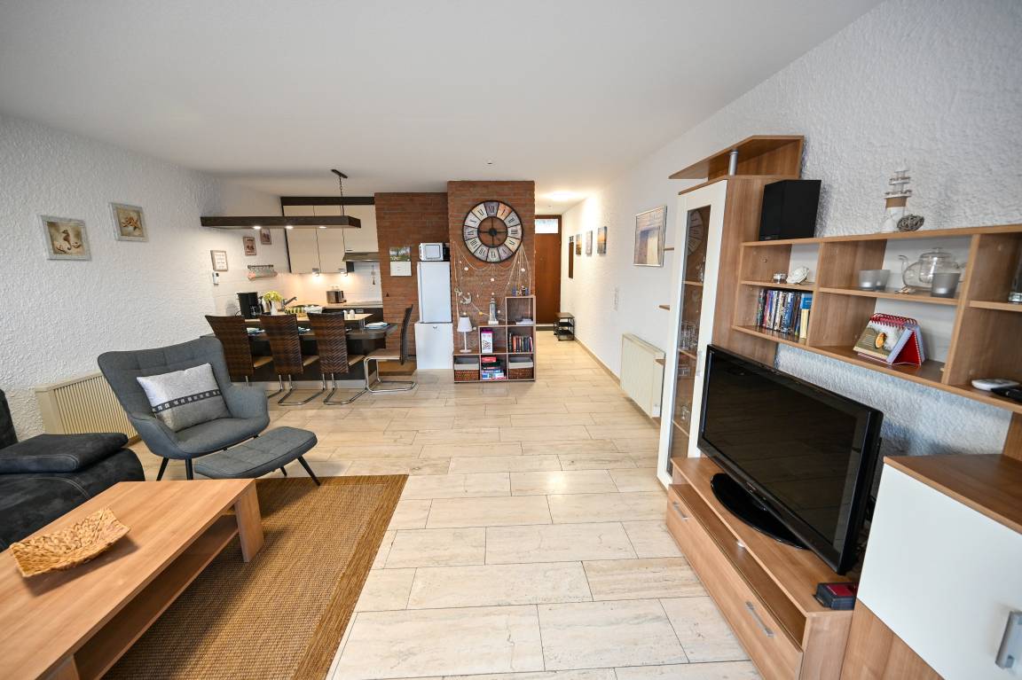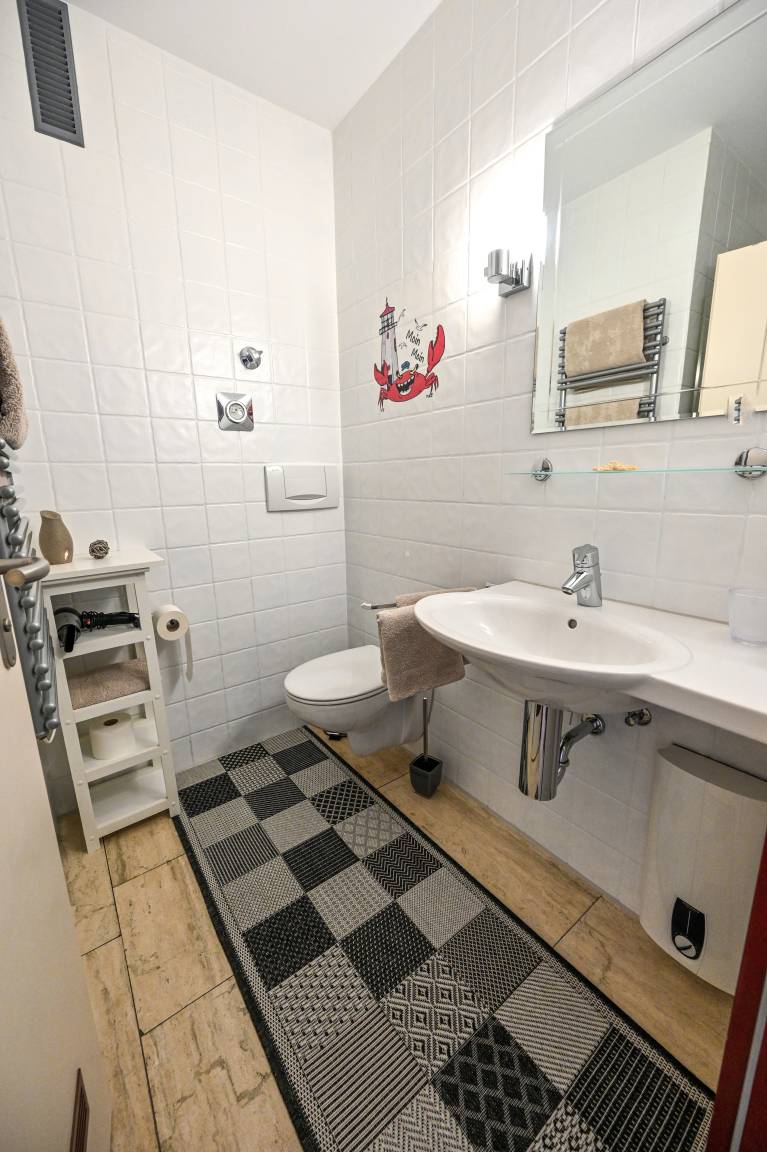 Für andere Unterhaltung sorgt unsere kleine Spiel- sowie Buchsammlung in der Wohnung. Die moderne Elektroheizung – für die Frostbeulen unter uns – sorgt für angenehme Wärme. Zudem ist die Unterkunft bequem über einen Fahrstuhl oder das Treppenhaus erreichbar. Das Haus "Seeadler" ist überdies barrierefrei. Die Wohnung liegt ruhig und dennoch zentral. In etwa 10 Minuten Fußweg erreicht man den Friesenstrand mit einem tollen Abenteuerspielplatz sowie Bäcker, diversen Gaststätten und Restaurants und einem Fahrradverleih. Das tropische Erlebnisbad Aqua Mundo befindet sich genau gegenüber von der Unterkunft – der Badespaß für Jung und Alt ist gesichert.