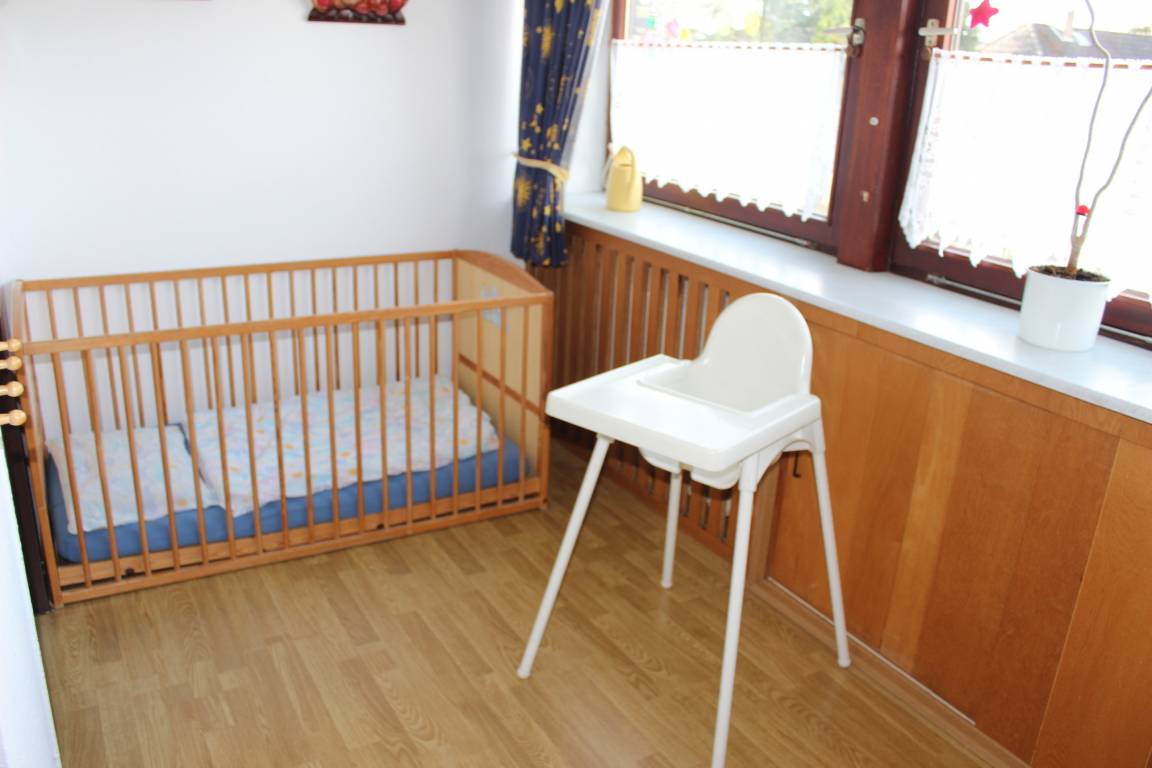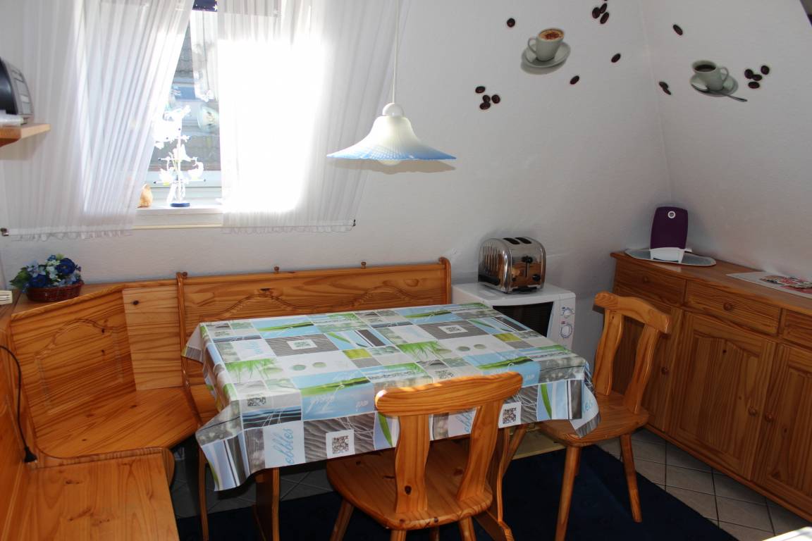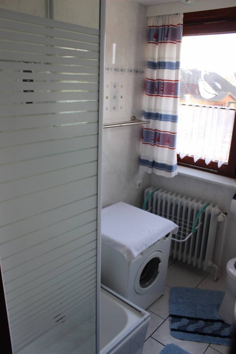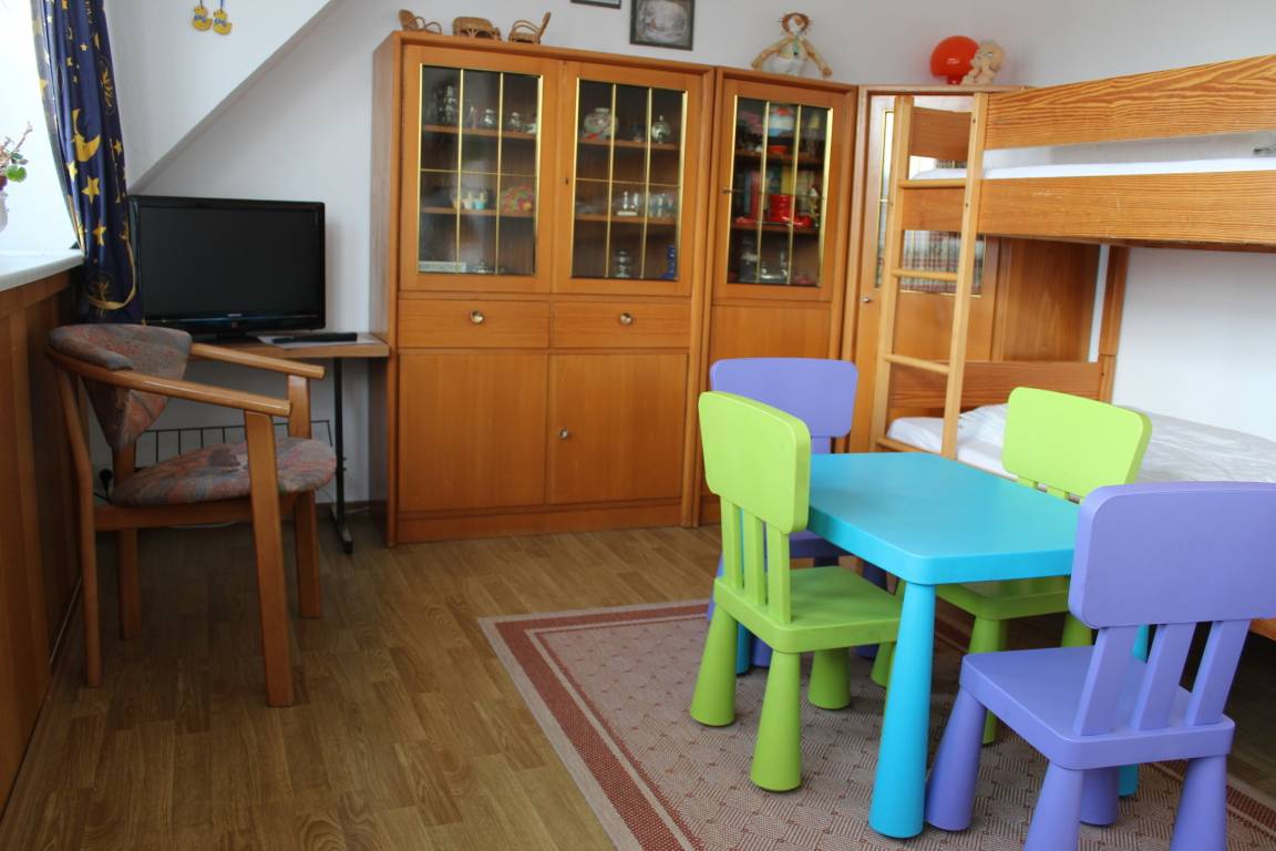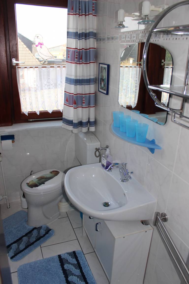 Hier finden Sie Ihnen eine sehr persönlich eingerichtete Ferienwohnung, sie liegt strandnah, zentral und doch ruhig. Sie befindet im Obergeschoss, hat ein gemütlich eingerichtetes, 60 qm großes Wohnzimmer, in dem Sie nicht nur TV sondern auch Spiele und Bücher zur Verfügung haben. Die Küche mit Essgruppe ist u.a. mit einem Backofen, Kühlschrank mit Gefrierfach, Mikrowelle, Eierkocher, Toaster sehr gut ausgestattet. Im Doppelzimmer steht zusätzlich ein Gästebett, im zweiten Schlafzimmer befindet sich ein Kindergitterbett sowie Etagenbetten, die aber auch einzeln zu stellen sind. Alle Räume sind mit Laminat ausgestattet. Das Bad hat Dusche /WC und eine Waschmaschine und ein Trockner kann auf Anfrage mit genutzt werden (gegen Gebühr). Diese Wohnung verfügt über einen Balkon mit Sitzmöbeln. Es steht ein Kinderbett und ein Hochstuhl zur Verfügung. Für alle Gäste gibt es eine möblierte Terrasse im Garten. Dort können Sie auch einen Grill, einen Strandkorb, einen Kinderpool (2,60 m x 2,60 m) und eine Wäschespinne nutzen.