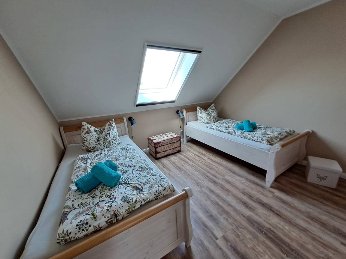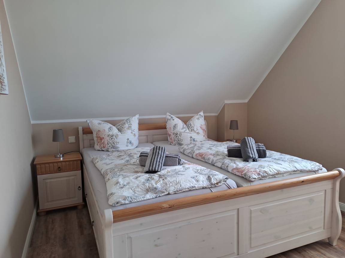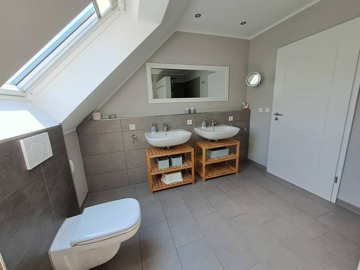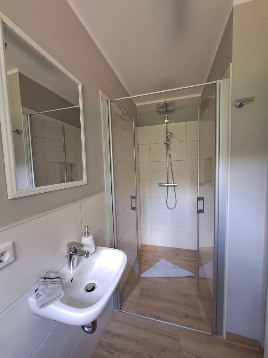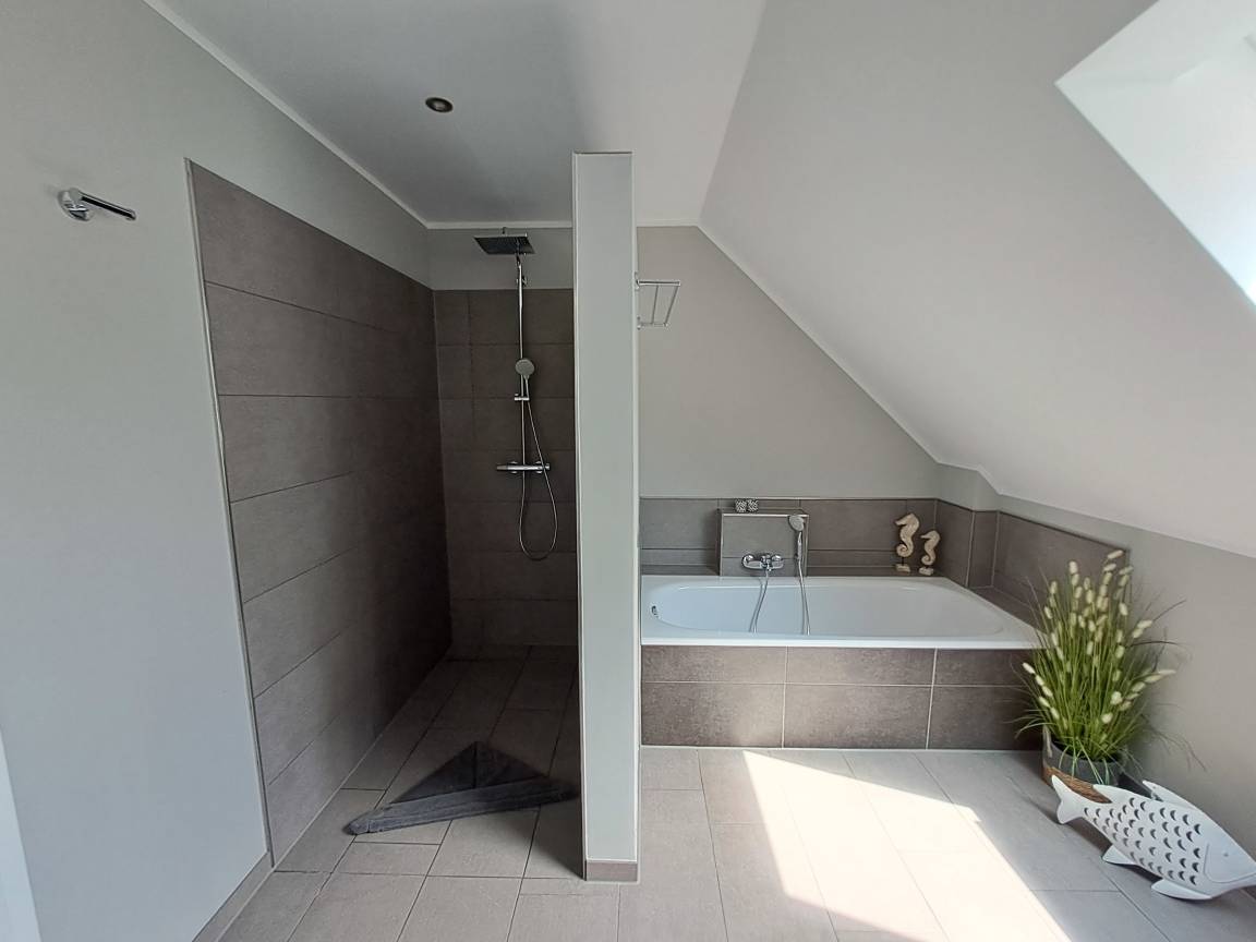 Im OG befinden sich 2 Schlafzimmer mit Doppelbetten(180x200), Smart TV und viel Stauraum. Ein weiteres Schlafzimmer verfügt über zwei Einzelbetten (100x200). In allen Schlafzimmern befindet sich ein Insektenschutz. Das moderne Tageslichtbad besticht durch eine große begehbare Rainshowerdusche, Badewanne und einen Doppelwaschtisch. Zusätzlich befindet sich im EG ein zweites Bad mit WC und begehbarer Rainshowerdusche.