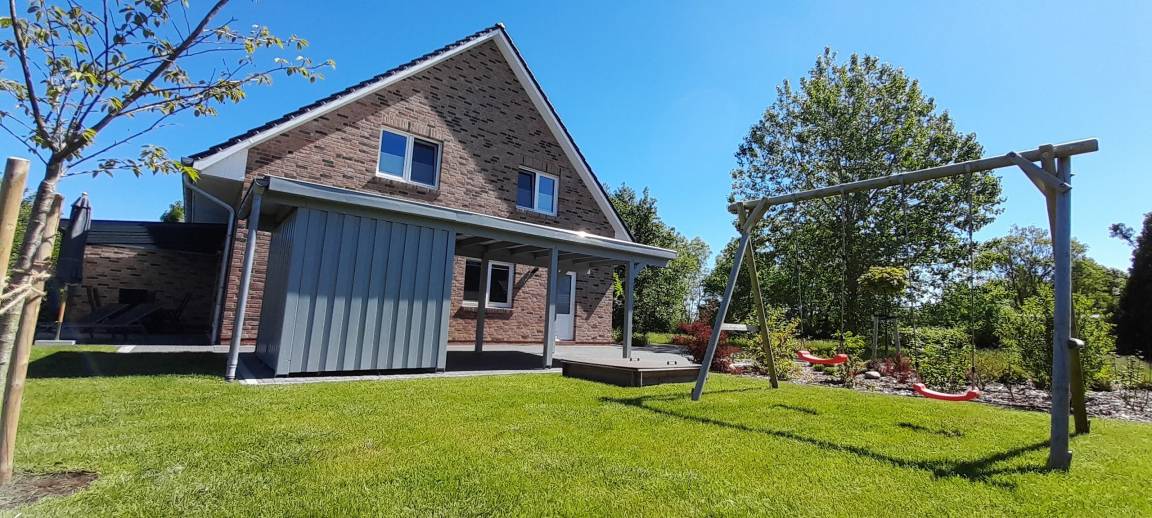 Das Haus verfügt über eine überdachte Terrasse mit Grill und zwei Sonnenliegen. Im schönen angelegten Garten steht eine Doppelschaukel und ein Sandkasten für die Kinder bereit.