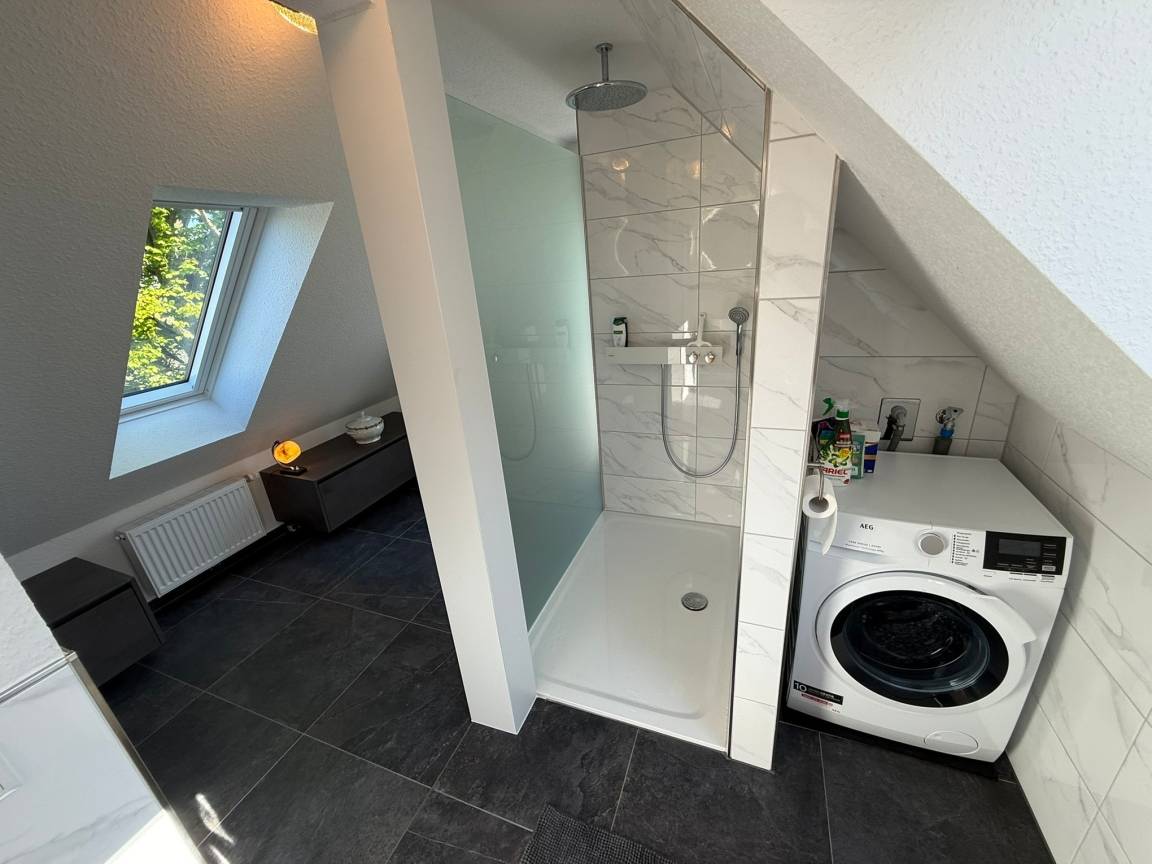 - Schickes Badezimmer mit großer Dusche und Waschtrockner
