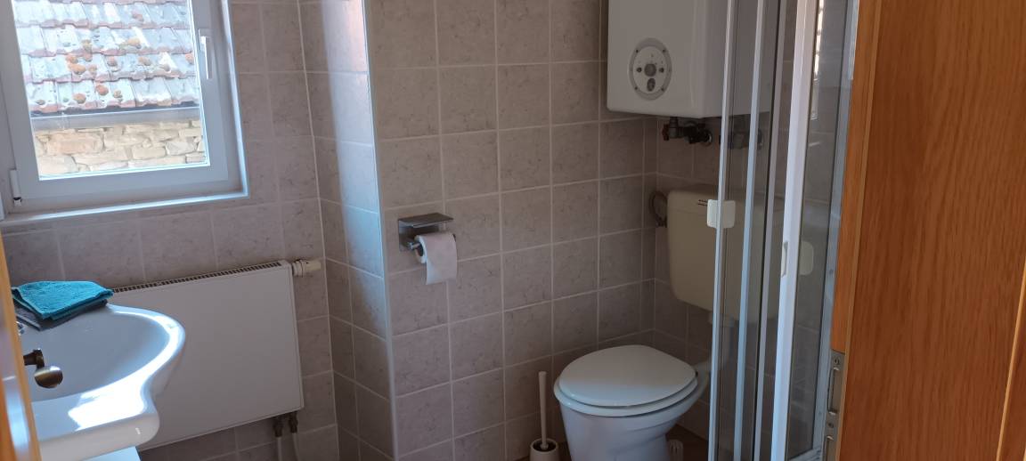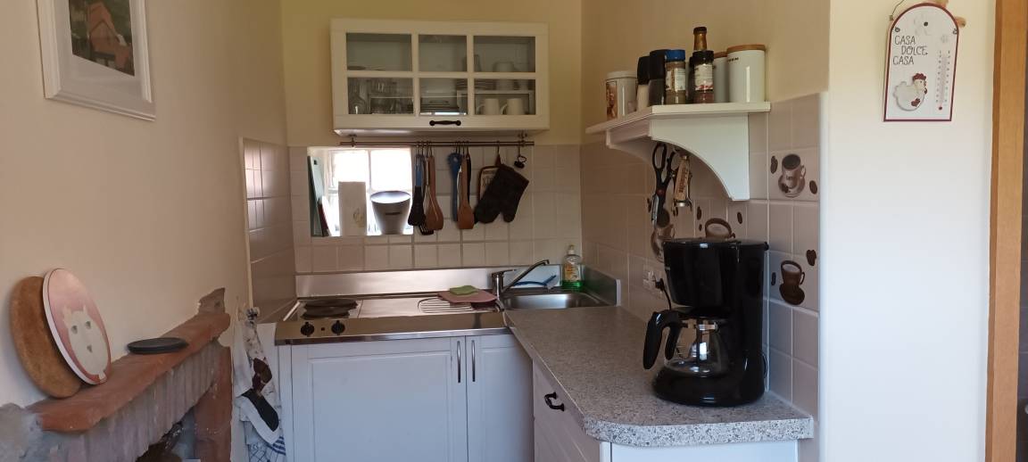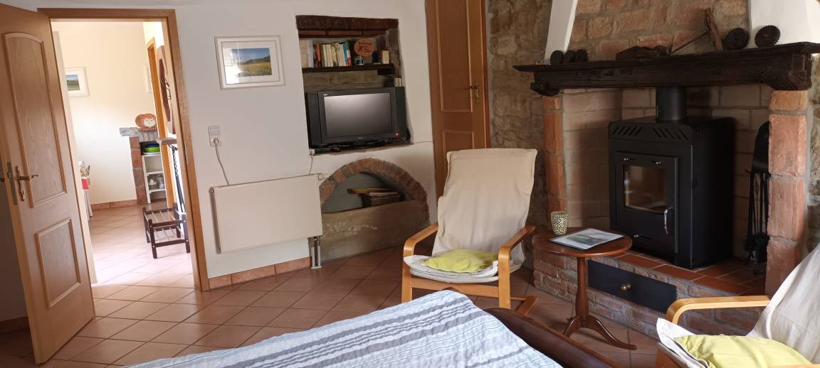 Die Wohnung verfügt über einen Wohn-Schlafbereich mit Sitzgelegenheit und einem Holzofen. In der kleinen Küche gibt es einen 2-Platten Herd, einen Kühlschrank und einen gemütlichen Sitzplatz.