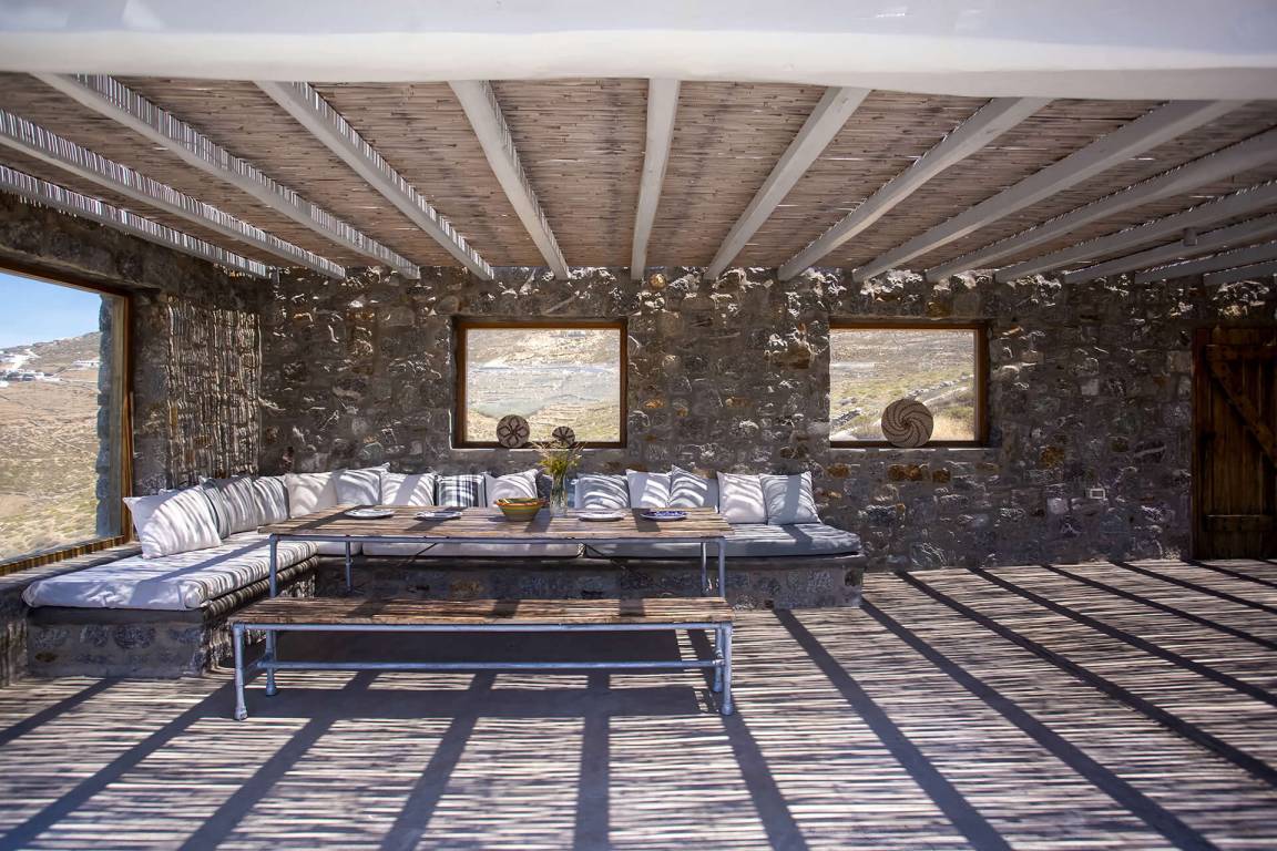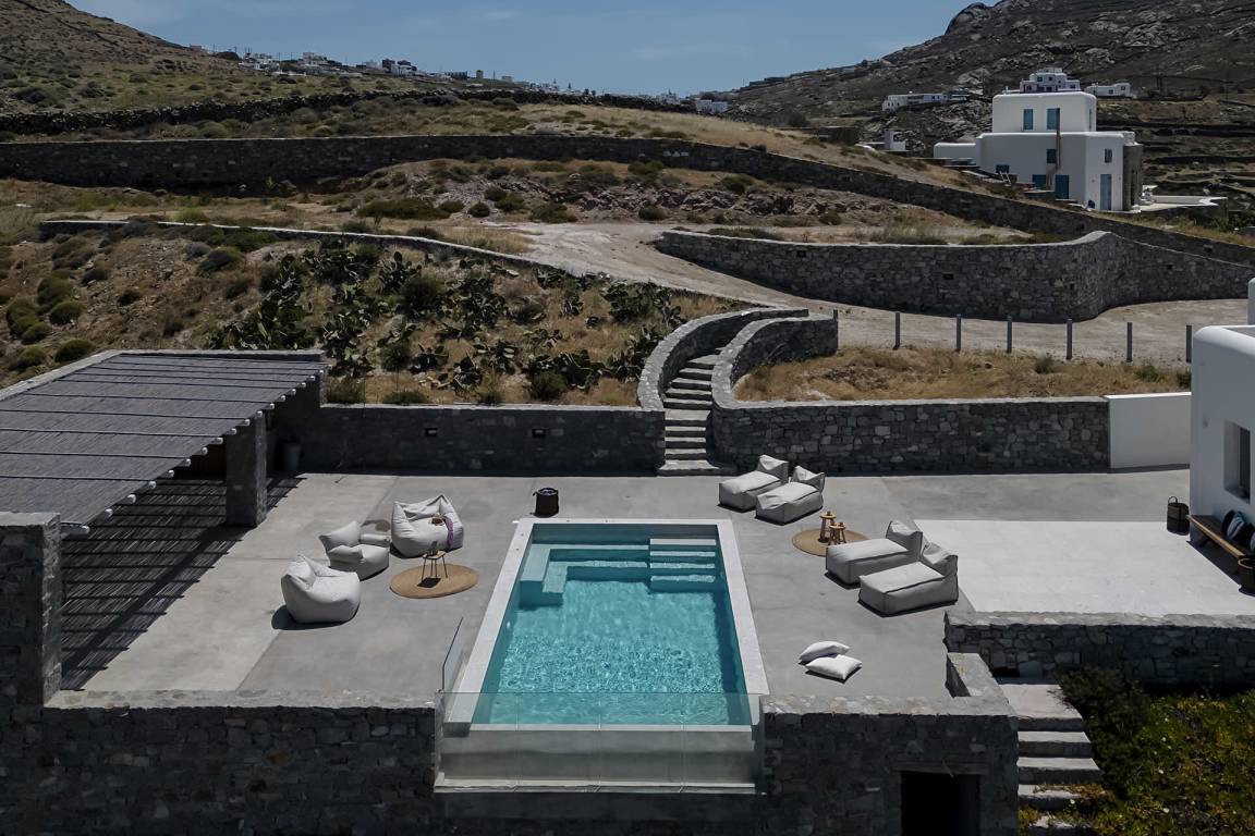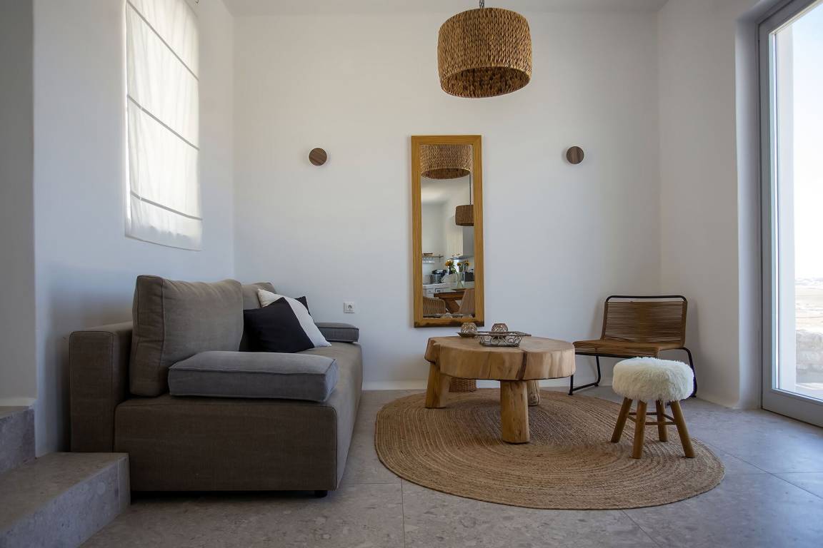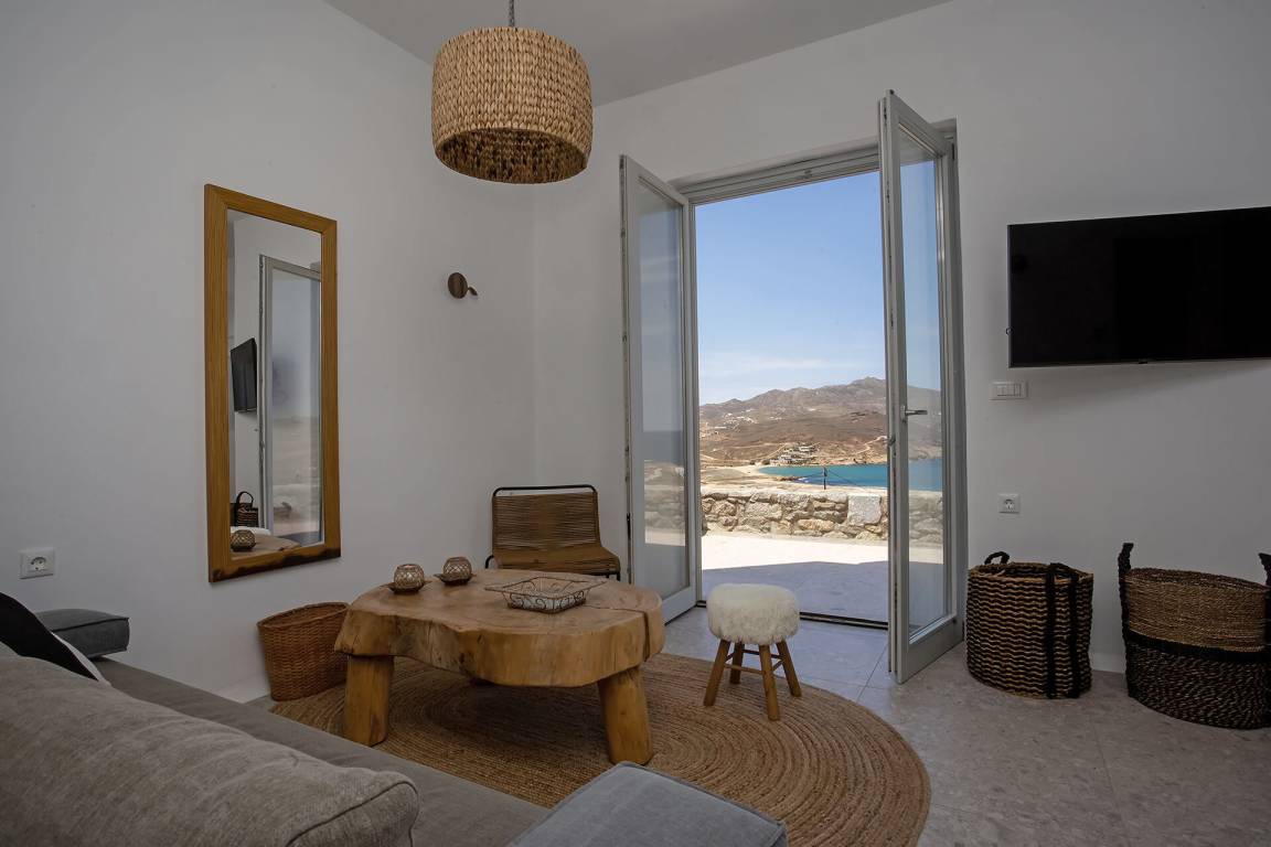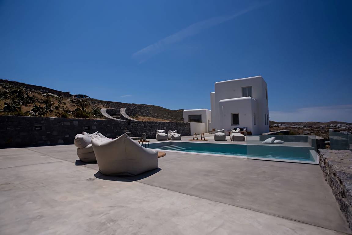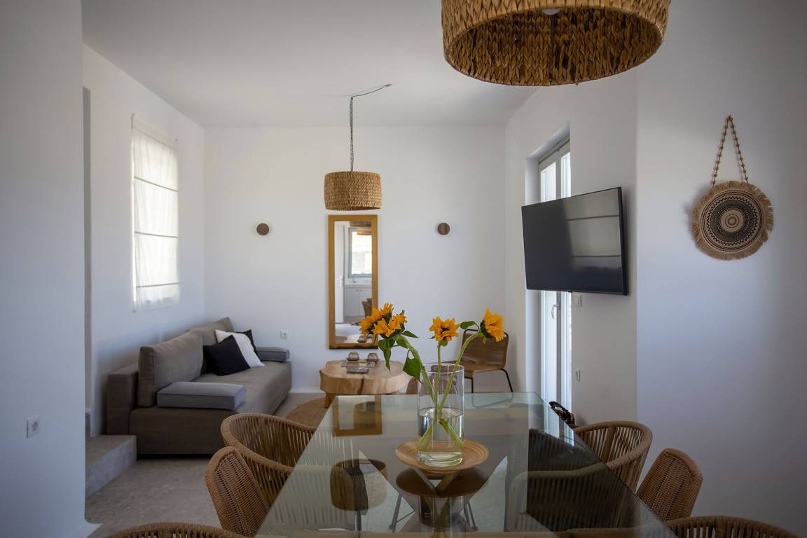 Die Villa auf Mykonos bietet Platz für bis zu 7 Gäste und verfügt über 3 Schlafzimmer und 3 Bäder. Die Räumlichkeiten sind so gestaltet, dass Wohn-, Ess- und Schlafbereiche natürlich ineinander übergehen.