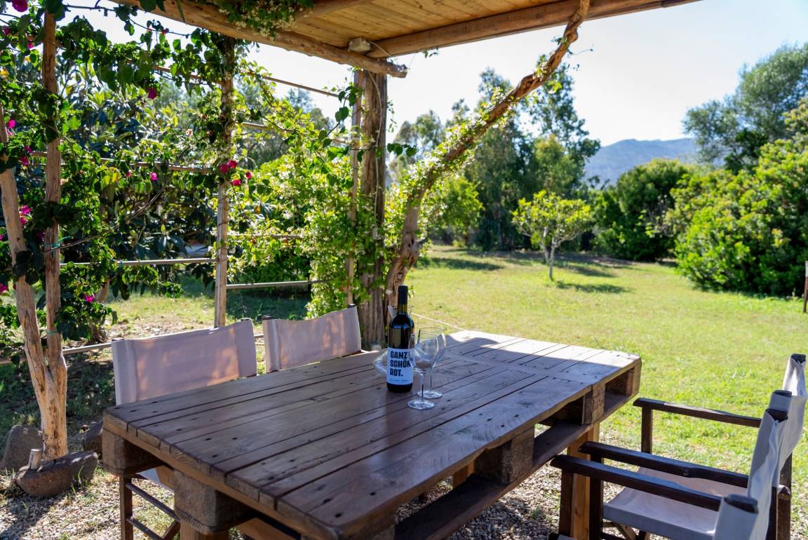 Die überdachte Veranda bietet einen schattigen Platz für den morgendlichen Kaffee und wer aufs Dach steigt, hat einen herrlichen Blick bis zum Meer.