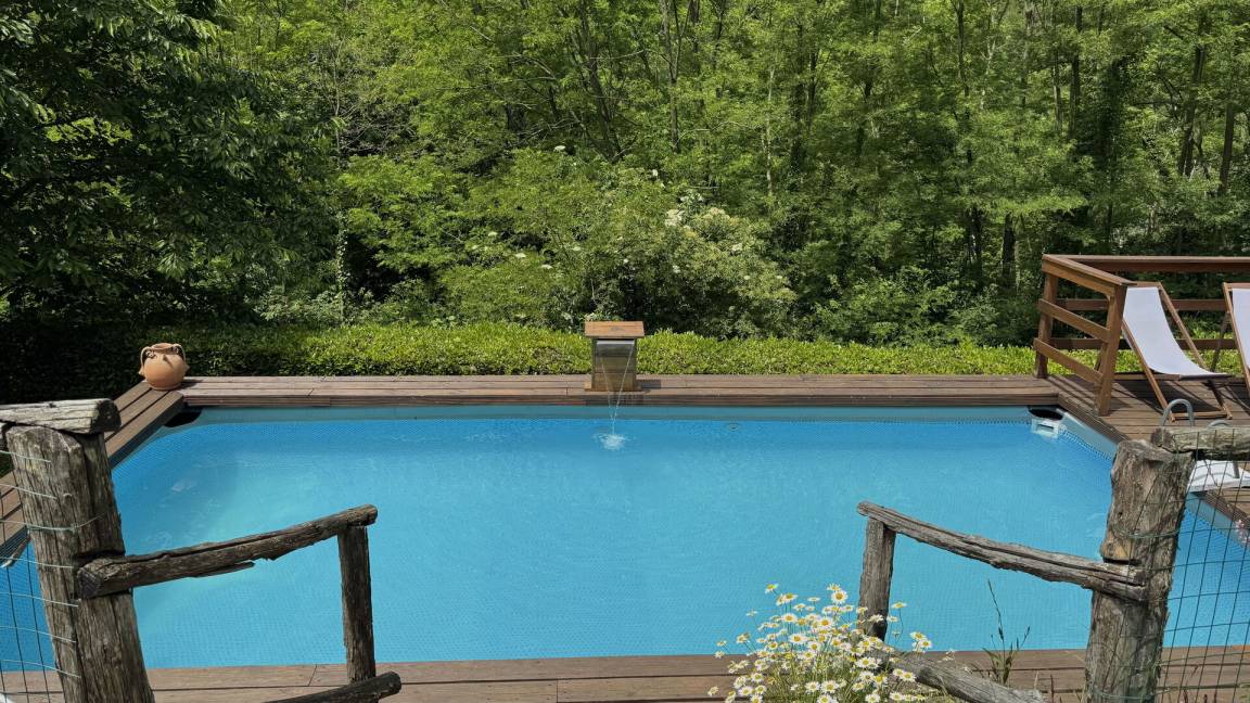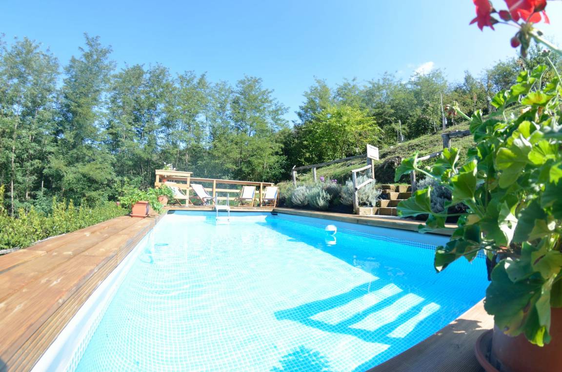 Garten: Schwimmbad (Breite: 3.8m, Länge: 7.3m, Tiefe: 1.2m), Grill, Außenbereich für das Essen im Freien, Gartenmöbel, vier Sonnenliegen.