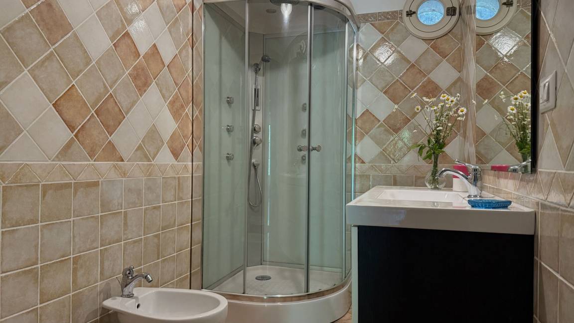 Badezimmer: Waschbecken, WC, Bidet, Dusche.