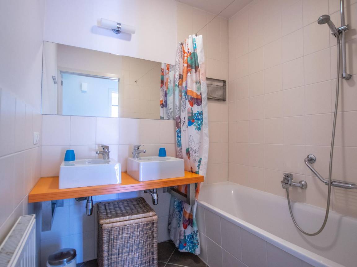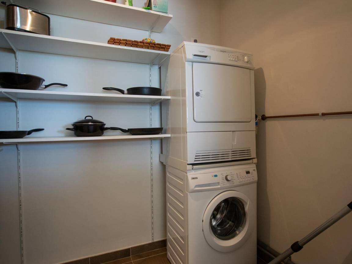 Layout : In der 1. Etage: Eingang, Küche mit Wasserkocher, Kochherd(4 Kochplatten, elektrisch), Dunstabzugshaube, Kaffeemaschine(pads), Kombi-Mikrowelle, Geschirrspüler, Kühlschrank(+ Gefrierfach) , Wohn/Esszimmer mit TV, Esstisch, Sitzecke, Radio , Schlafzimmer mit Doppelbett , Schlafzimmer mit Einzelbett, Etagenbett , Badezimmer mit Badewanne mit Dusche, Waschbecken, Waschbecken , Toilette, Wirtschaftsraum mit Wäschetrockner, Waschmaschine , 2x Balkon