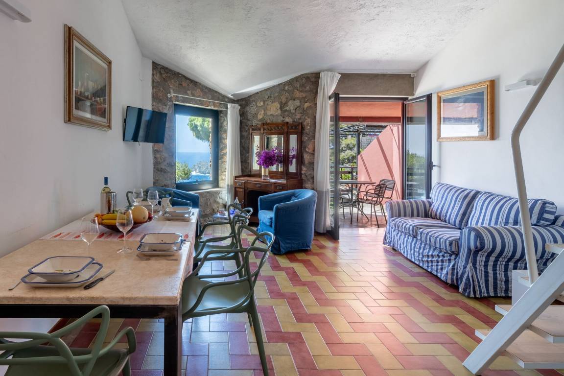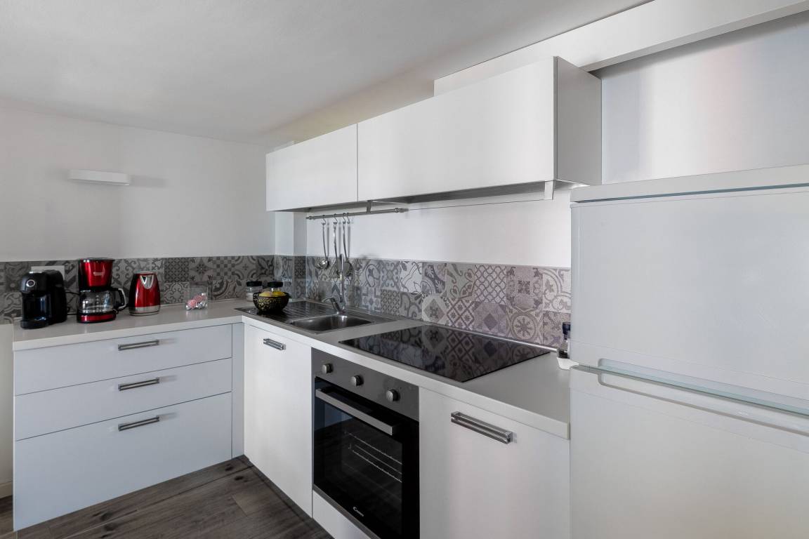 Wohnküche: gut ausgestattete Küche, Esstisch, Kühlschrank, Tiefkühler, Mikrowelle, Herd, Ofen, Amerikanische Kaffeemaschine, Sofa, WiFi Internet, Klimaanlage, Satelliten-TV, Ausgang auf den Balkon.