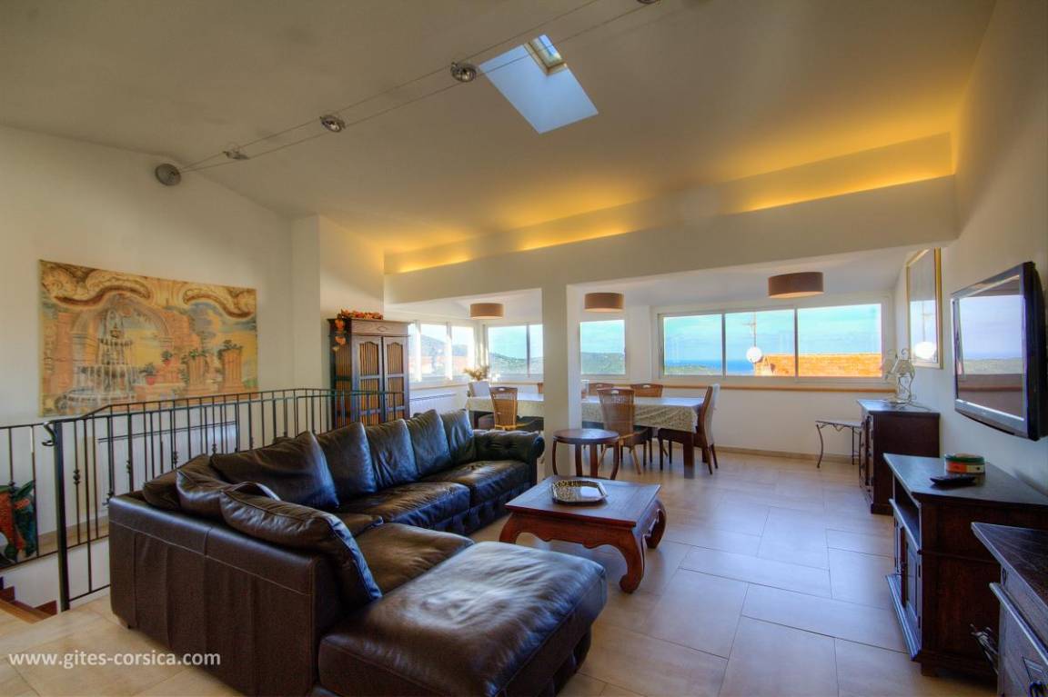 - Wohnzimmer/Küche mit Panoramablick auf Dorf, Berge und Meer.