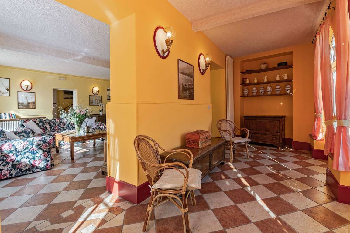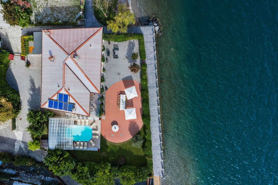 Das Erdgeschoss umfasst einen großzügigen Wohnbereich mit 4 Sofas, DVD-Player, Internetecke mit Wi-Fi und Stereoanlage. Bodentiefe Fenster zur Seite öffnen sich auf eine 400 Quadratmeter große Panoramaterrasse mit Seeblick. Auf dieser Ebene befinden sich zudem eine vollständig ausgestattete Küche, ein großes Esszimmer mit Tisch für 16 Personen, ein Spielzimmer für Kinder, 2 Gäste-WCs und 1 Badezimmer mit begehbarer Dusche für Gäste mit Mobilitätseinschränkungen.