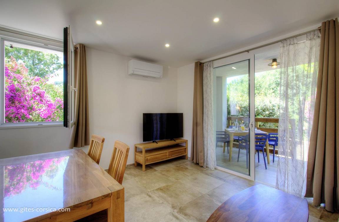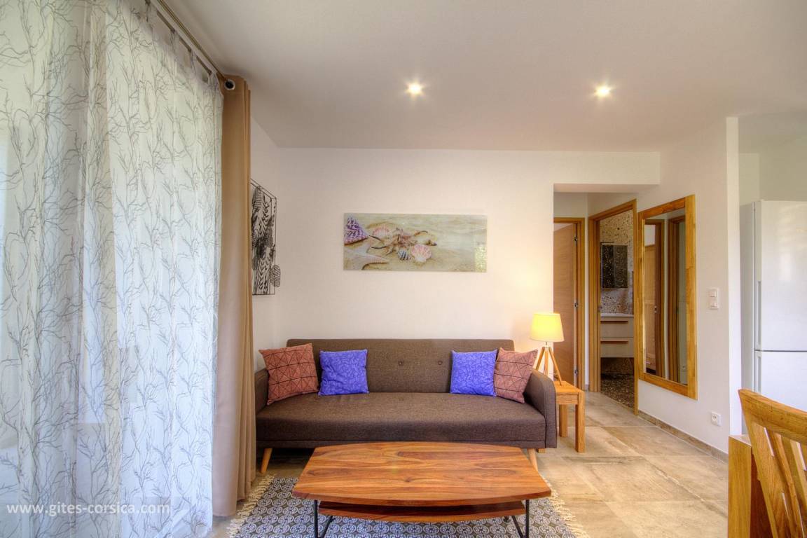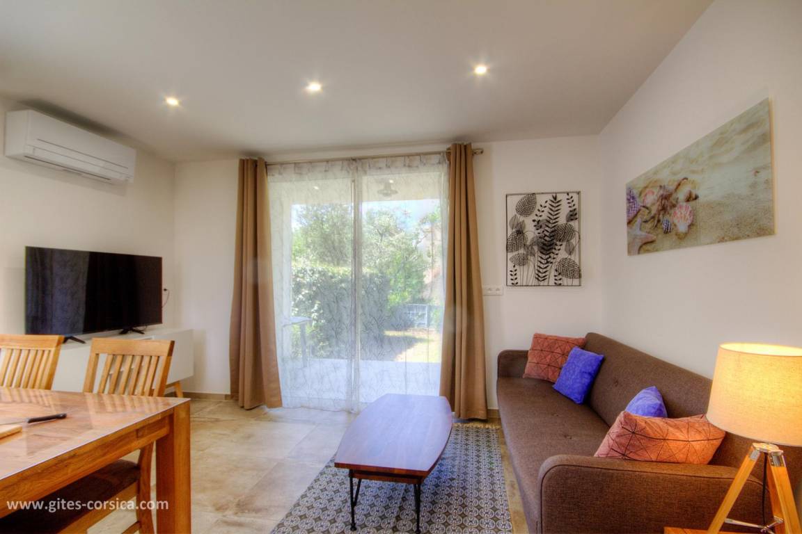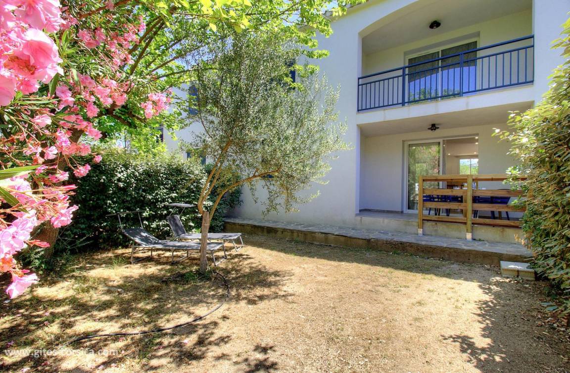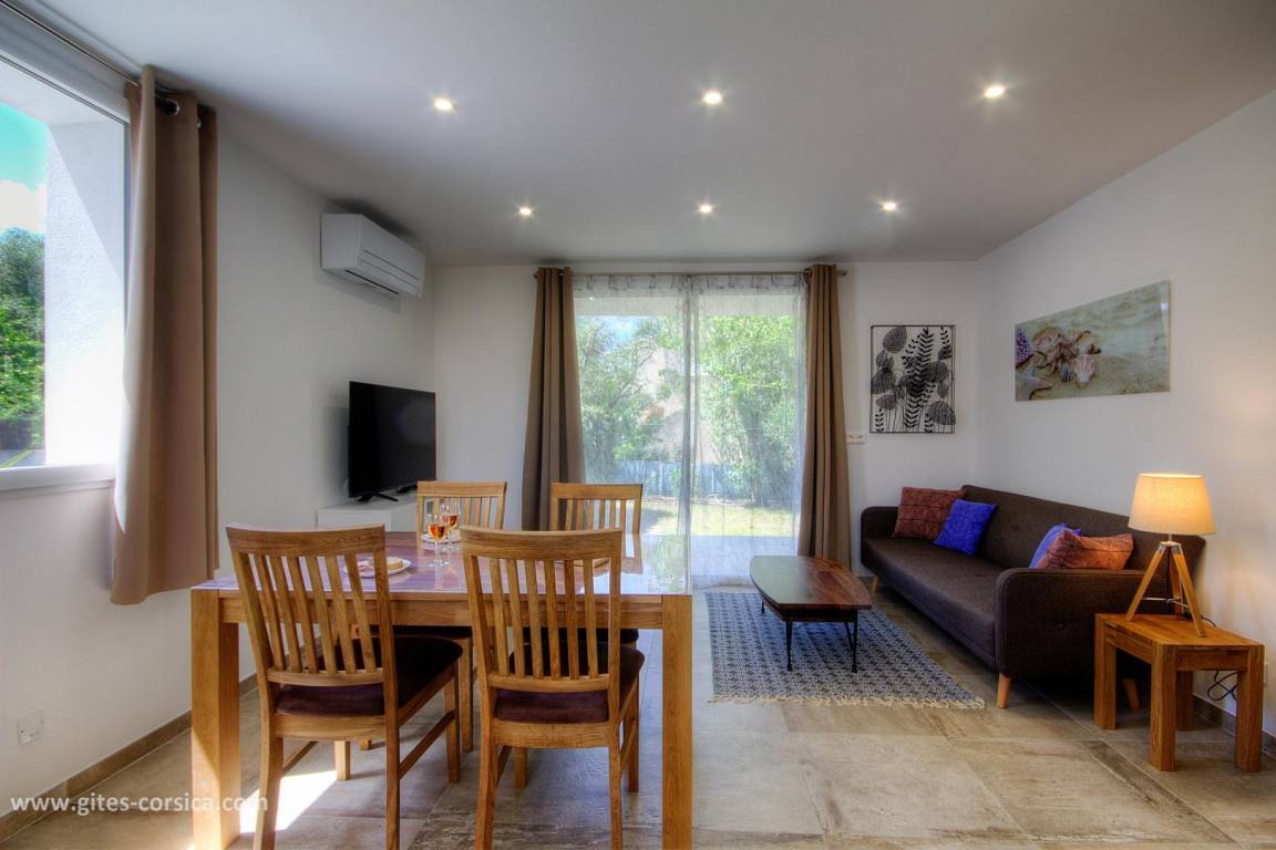 Auf einem 1400 m² großen, umzäunten Grundstück am Ortseingang von Calvi befindet sich diese 56 m² große Wohnung im Erdgeschoss eines freistehenden Hauses, das eine weitere Wohnung und zwei weitere Mietwohnungen im Obergeschoss umfasst. Sie ist wie folgt aufgeteilt: