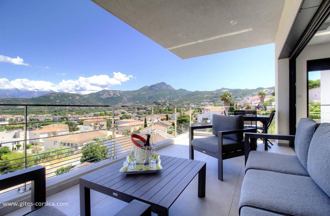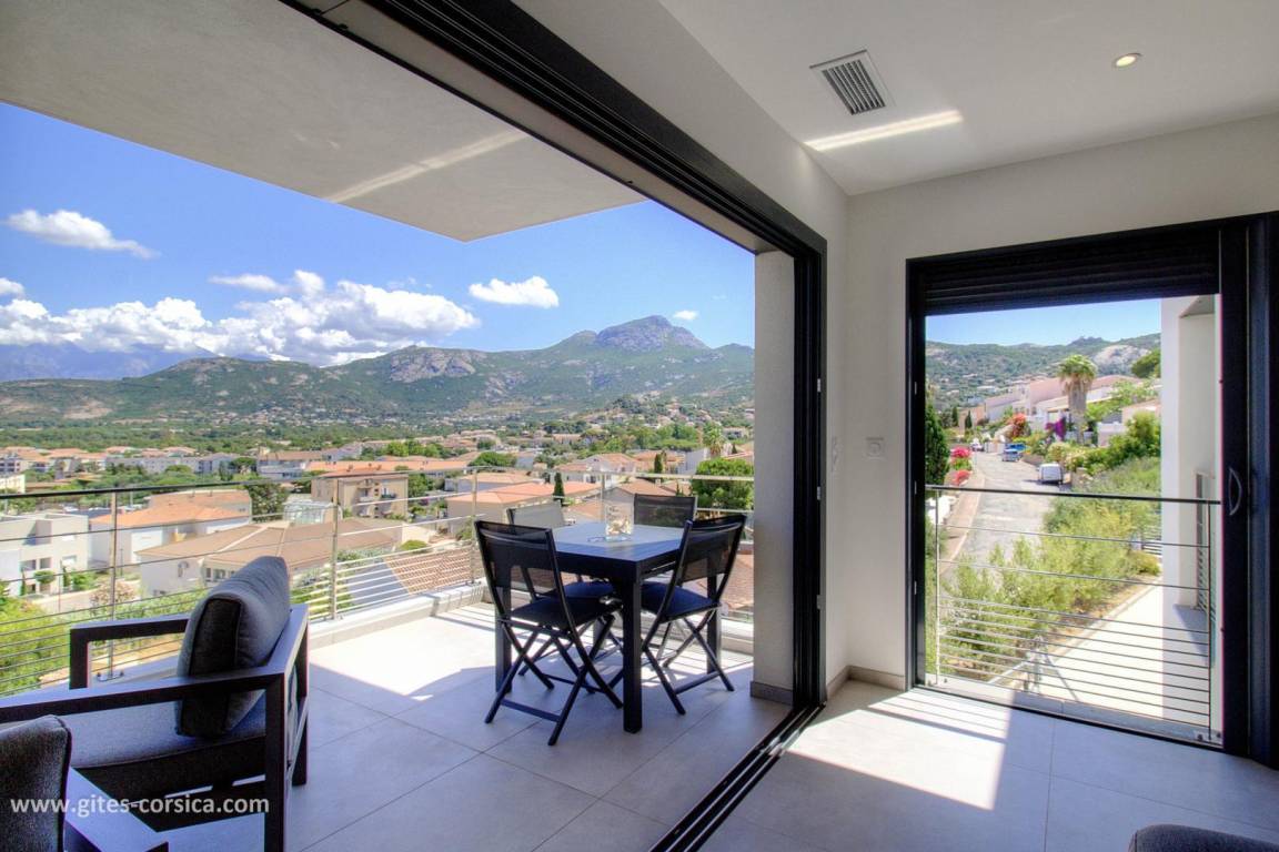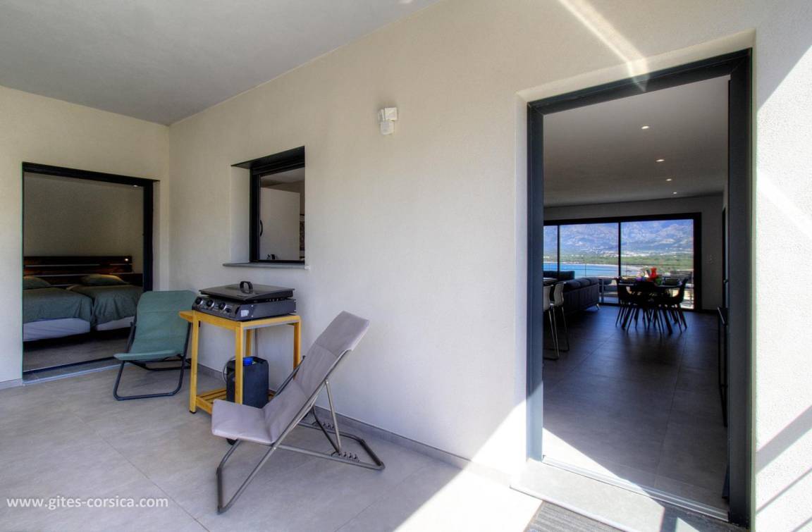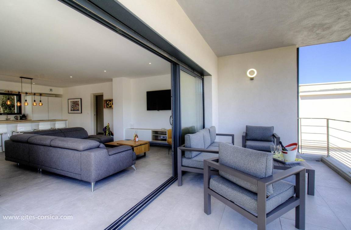 - 14 m² große Terrasse neben dem Wohnzimmer/Küche mit Blick auf das Meer und die Berge.