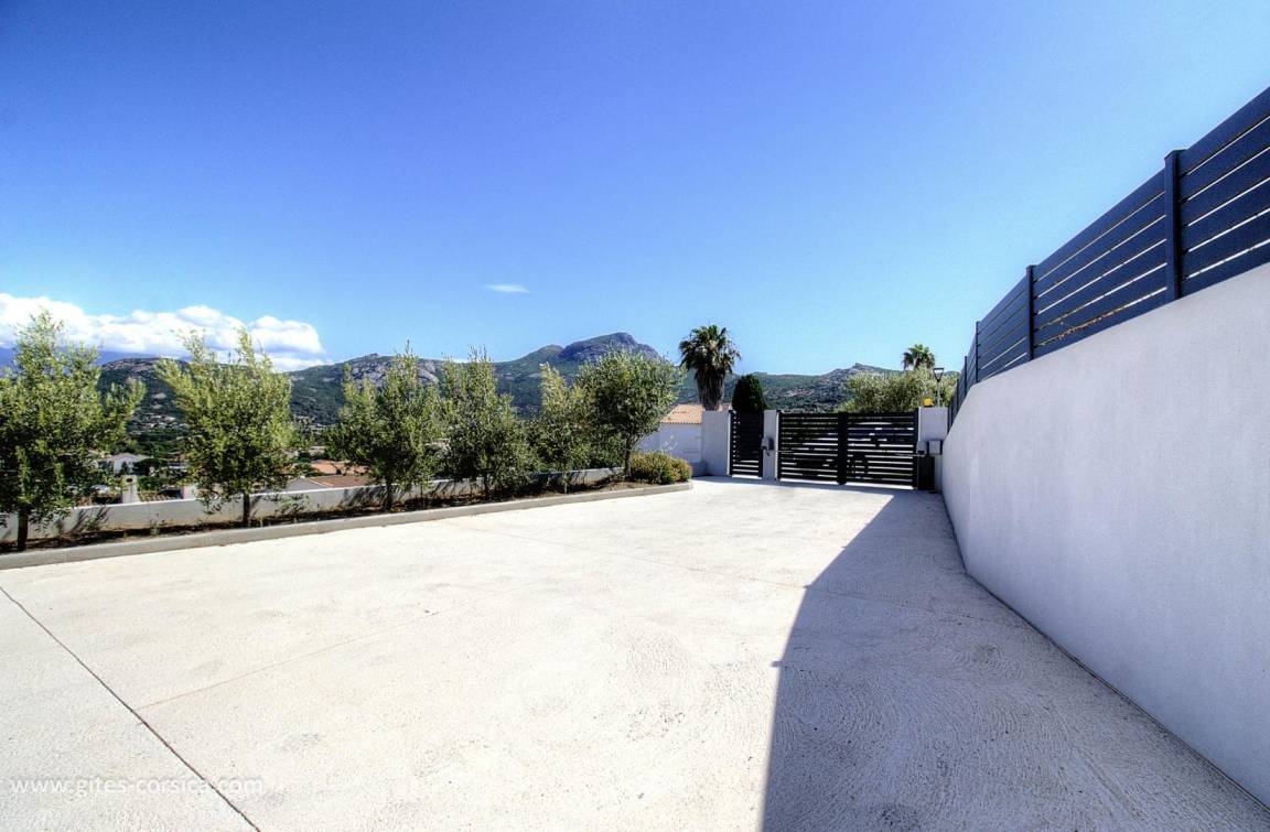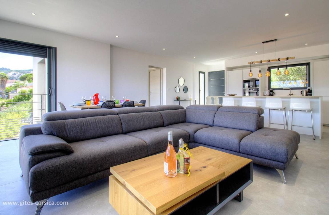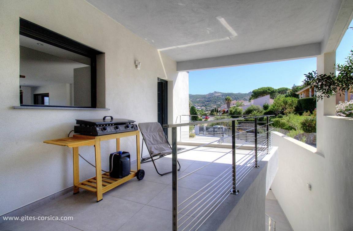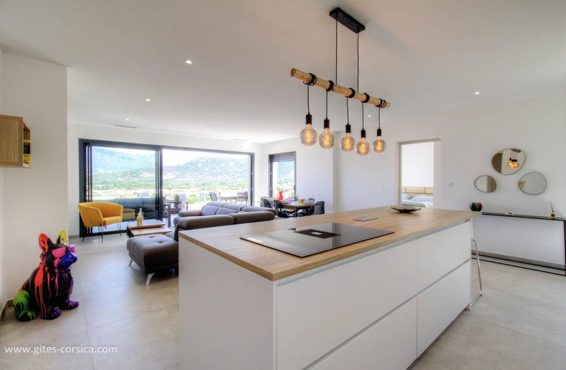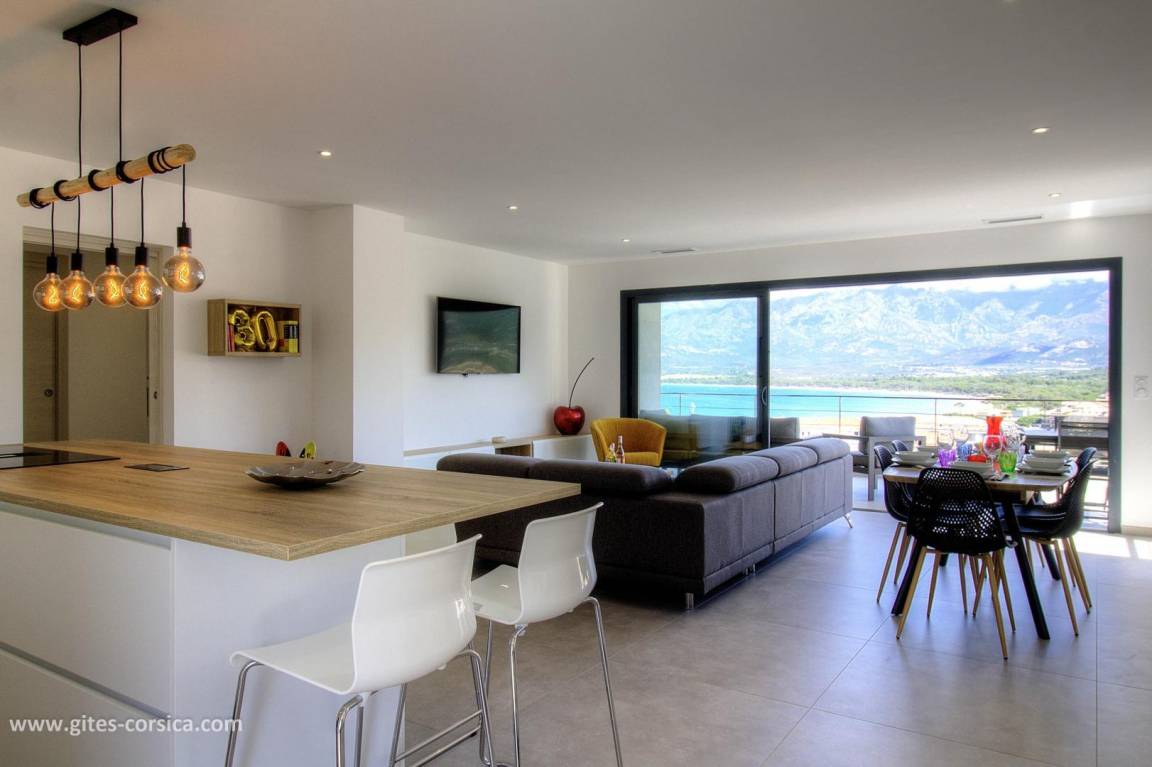 - 14 m² große Terrasse neben dem Wohnzimmer/Küche mit Blick auf das Meer und die Berge.