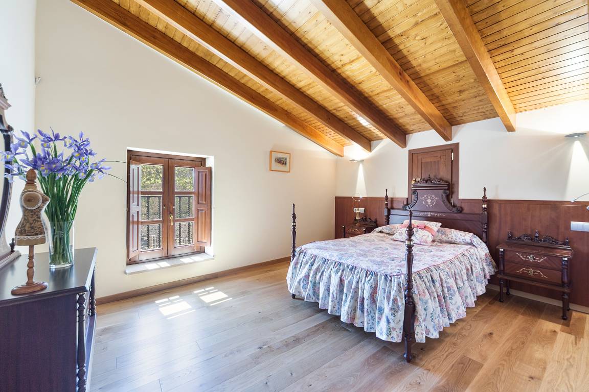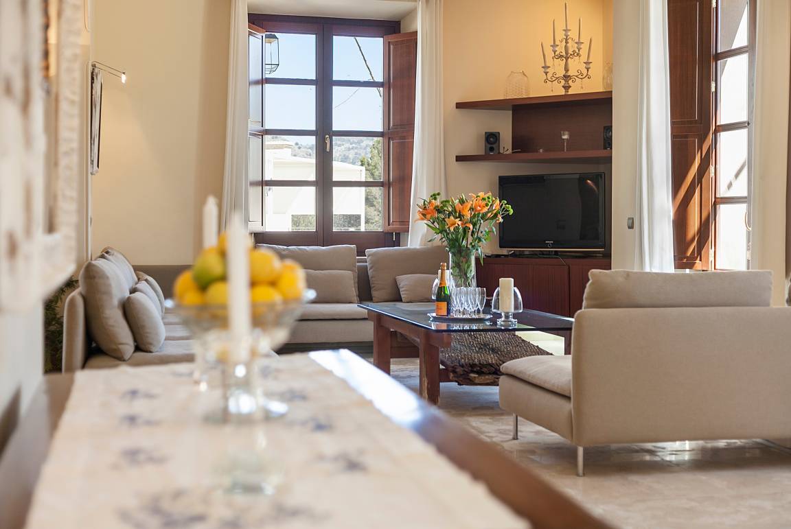 The house is bright and spacious with a wonderful mix of old and new decor that preserves its tradition while offering modern comforts. The lounge has comfortable sofas and a TV, an elegant dining area next to a big fireplace, and a fully equipped kitchen.